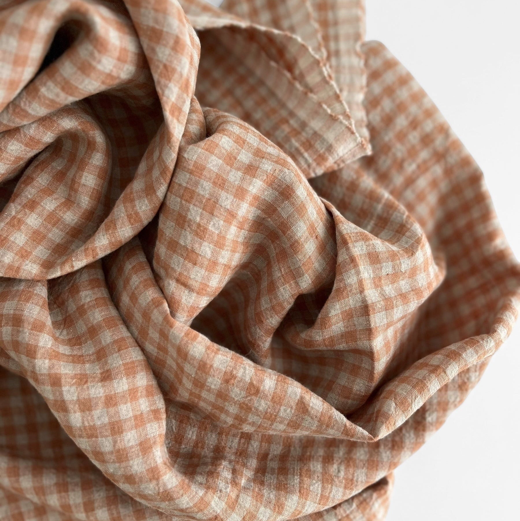 Premium quality 100% linen featuring a yarn dyed vintage gingham pattern. Colours include a muted apricot orange and natural flax.