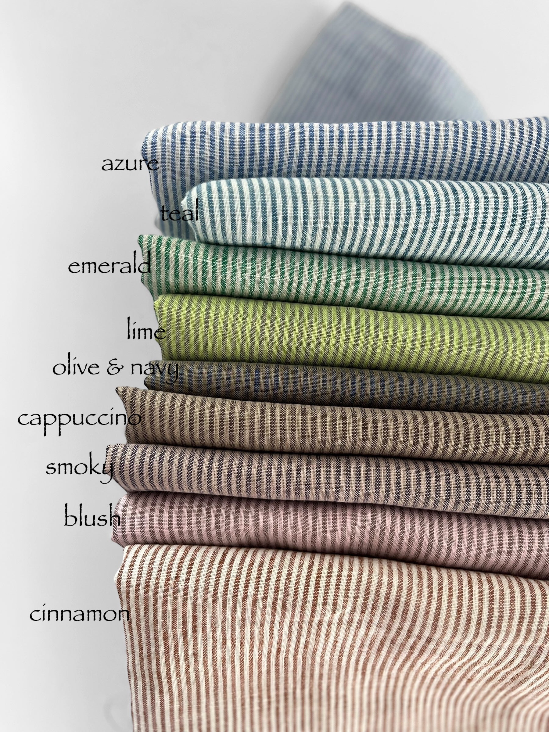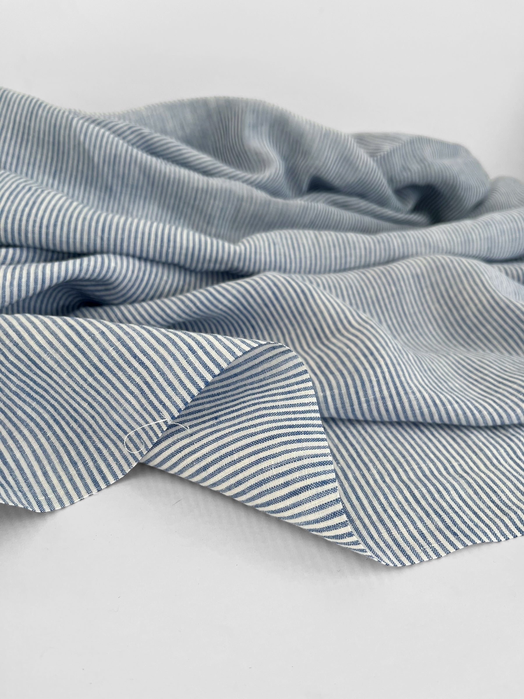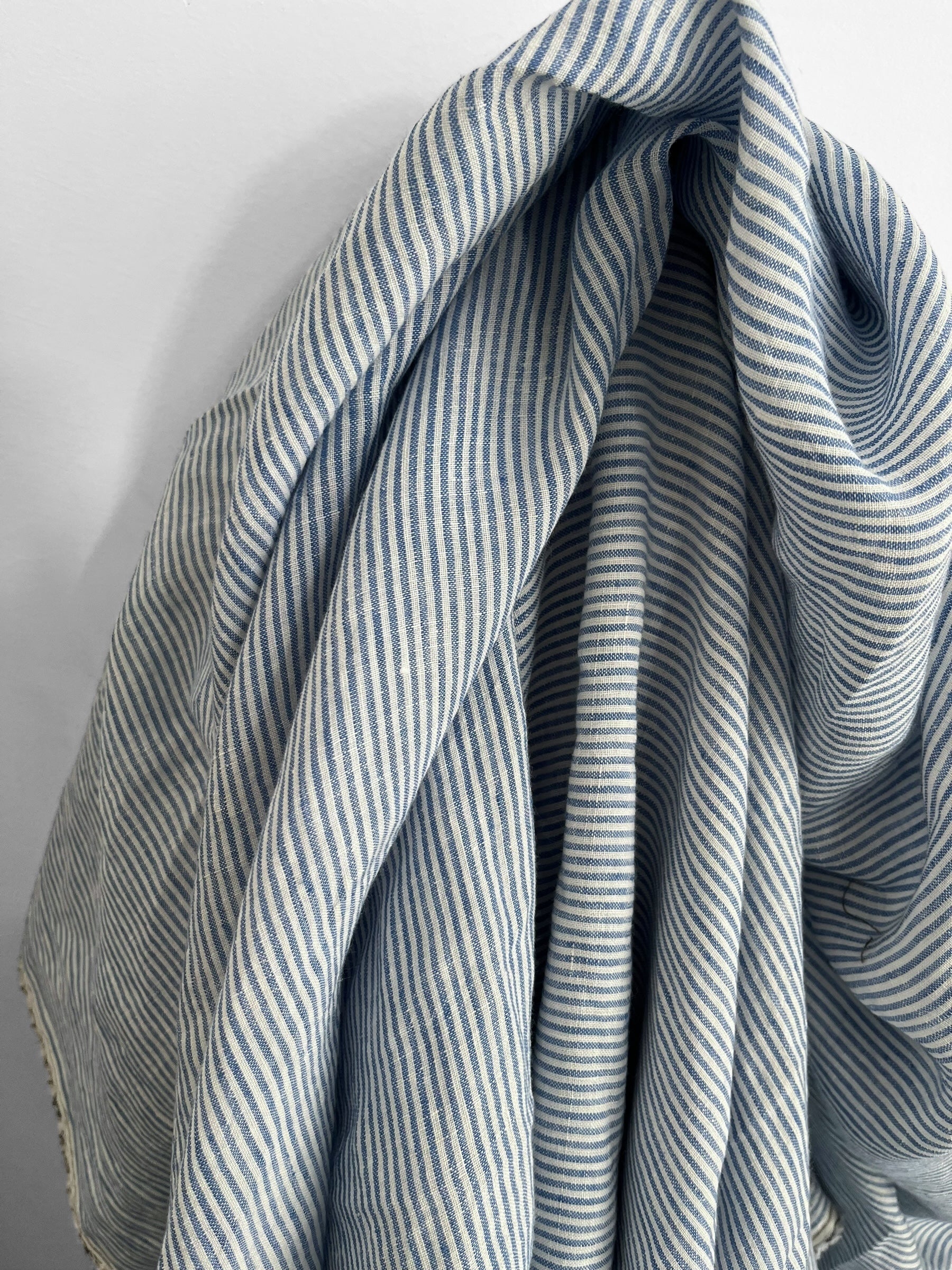 Pure yarn dyed linen sandwashed at the mill for softness. Colours include azure blue and white.