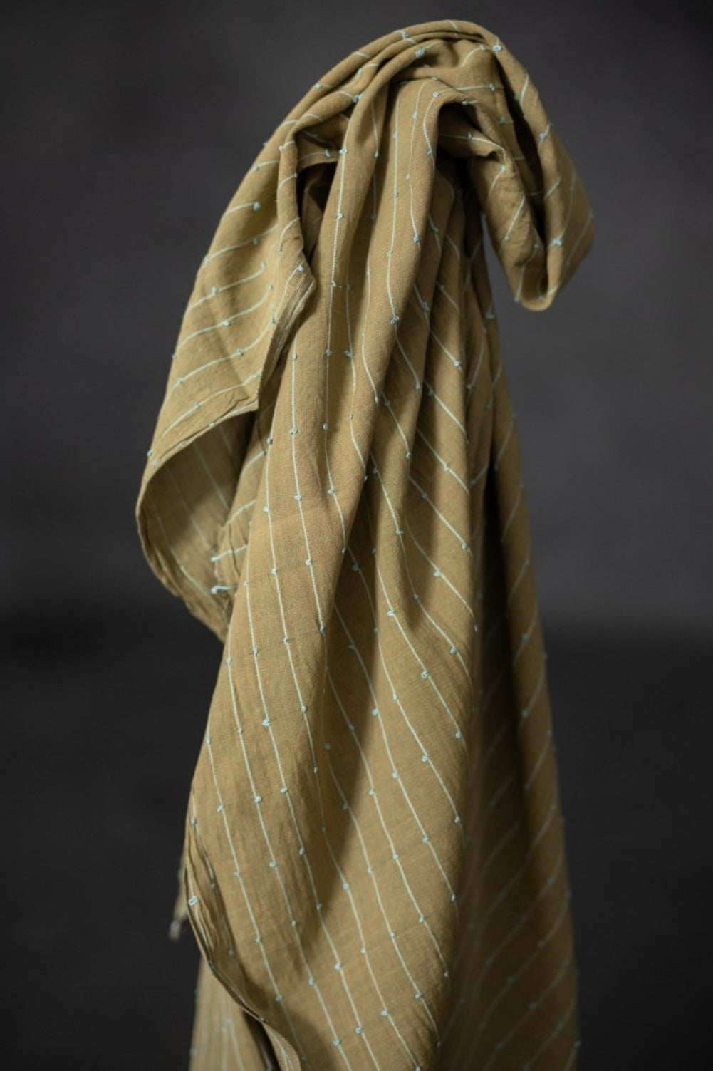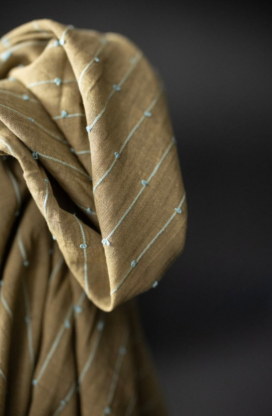 A slubby Indian checked cotton with woven colourful loops. A sage green background with aqua loops.