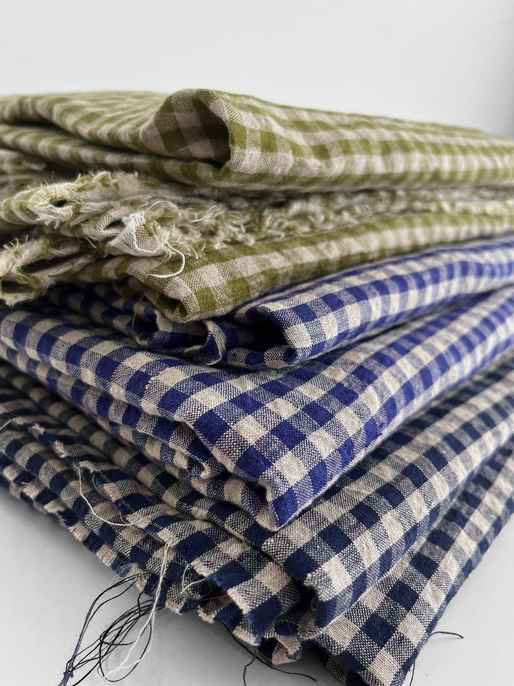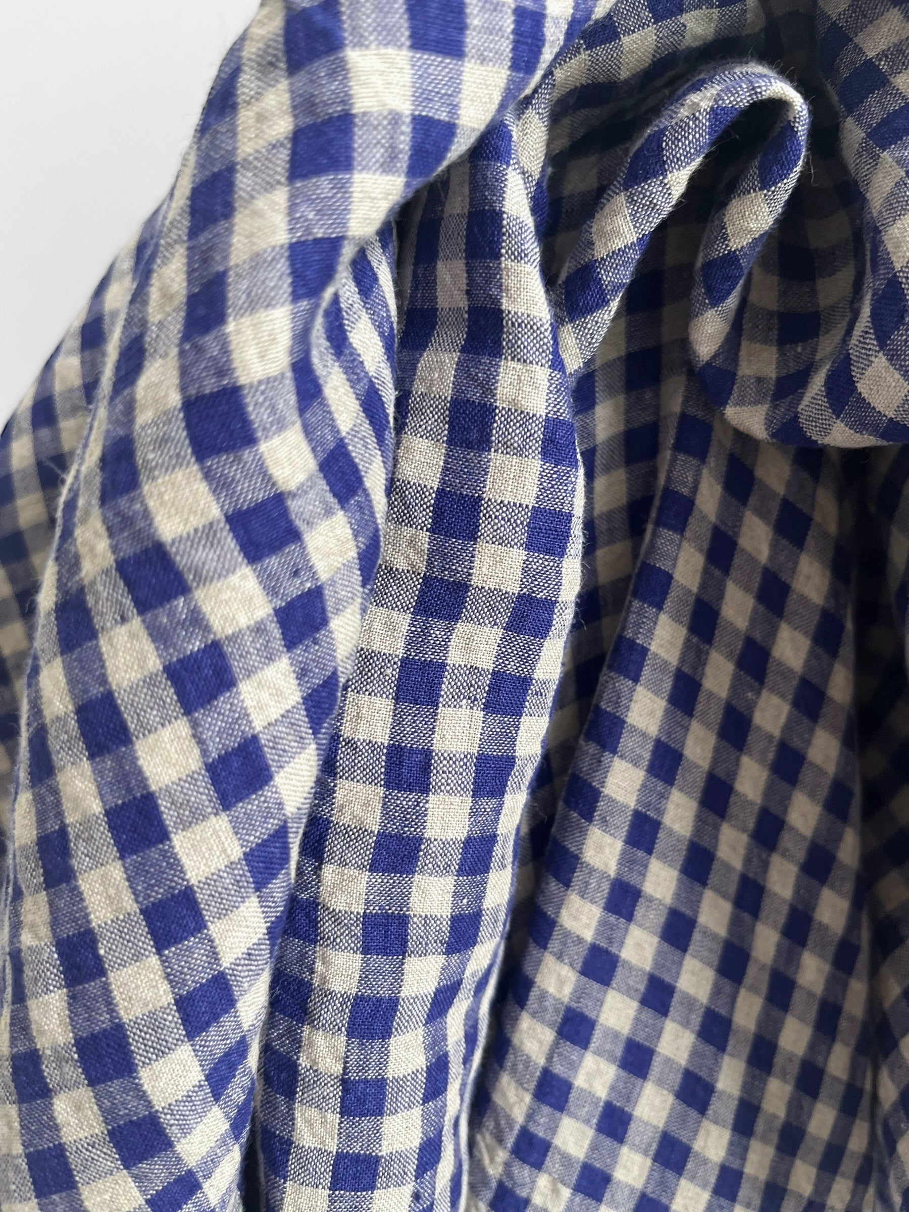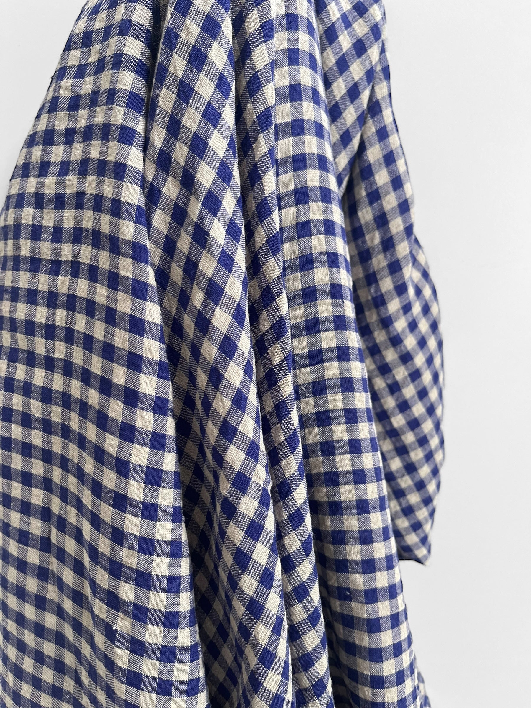 Premium quality 100% linen featuring a yarn dyed vintage gingham pattern. Colours include a cobalt blue and natural flax.