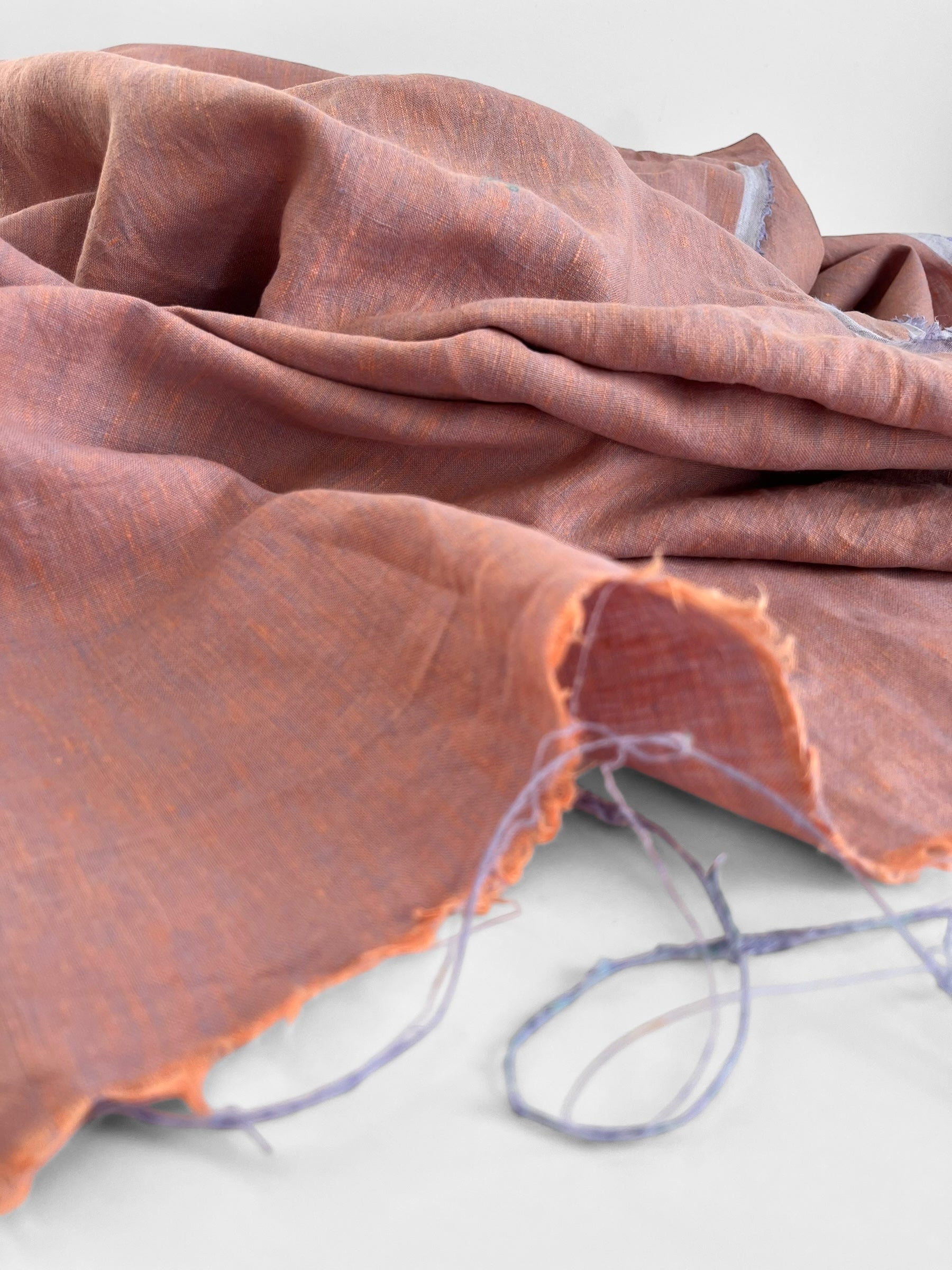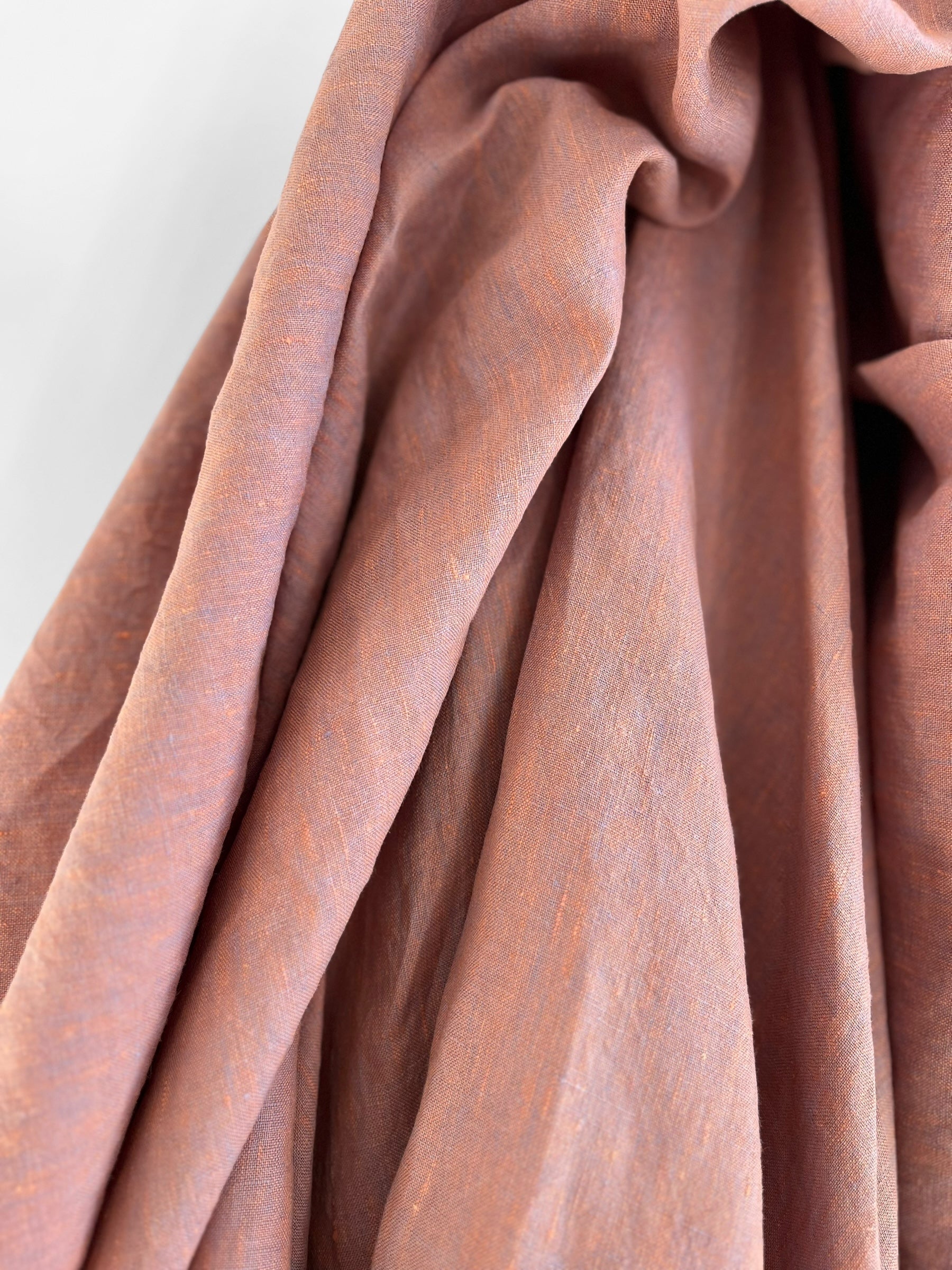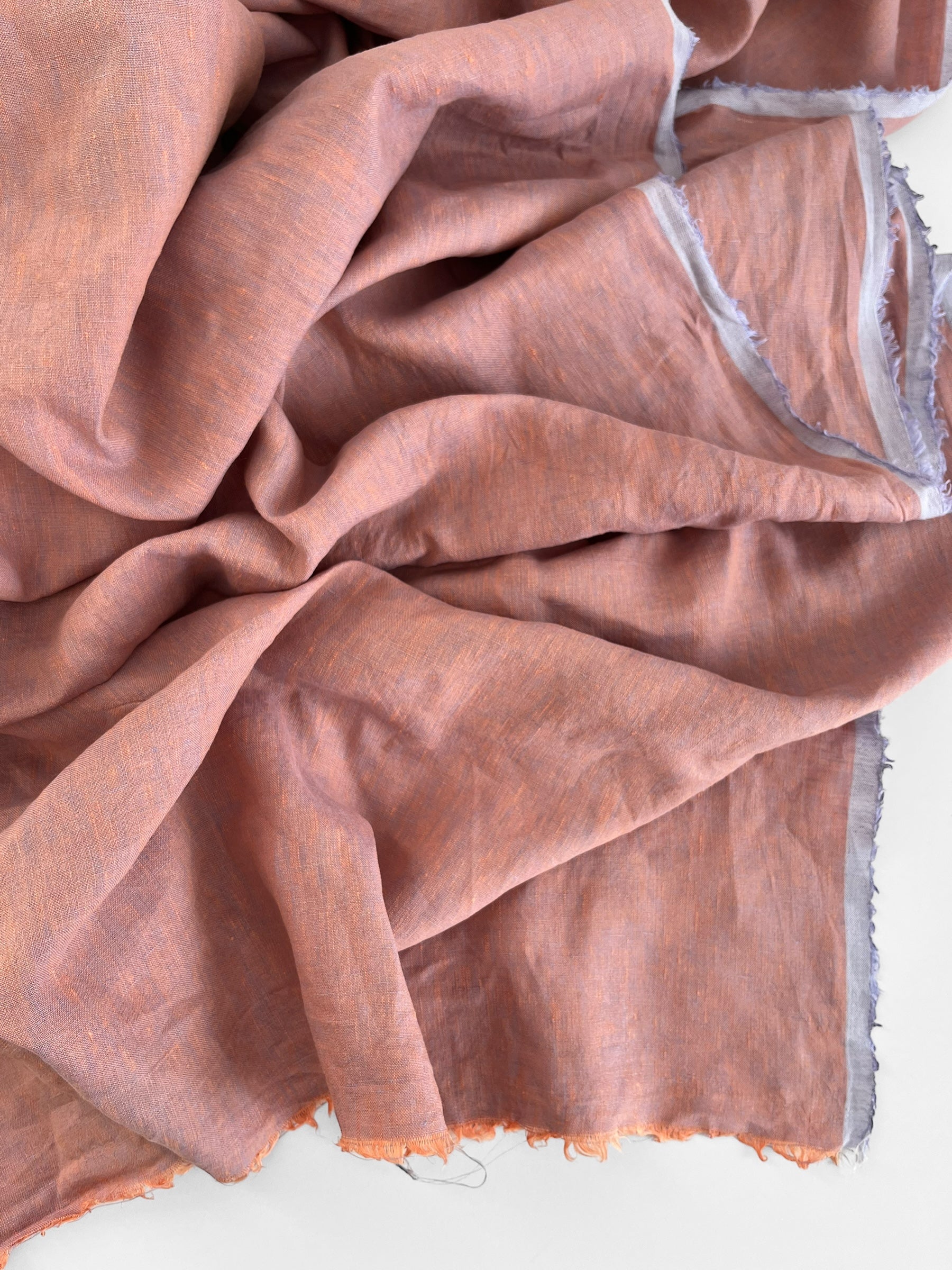 Premium quality linen/hemp blend woven out of two coloured yarn creating a unique melange look. Colours include coral orange and lavender purple.