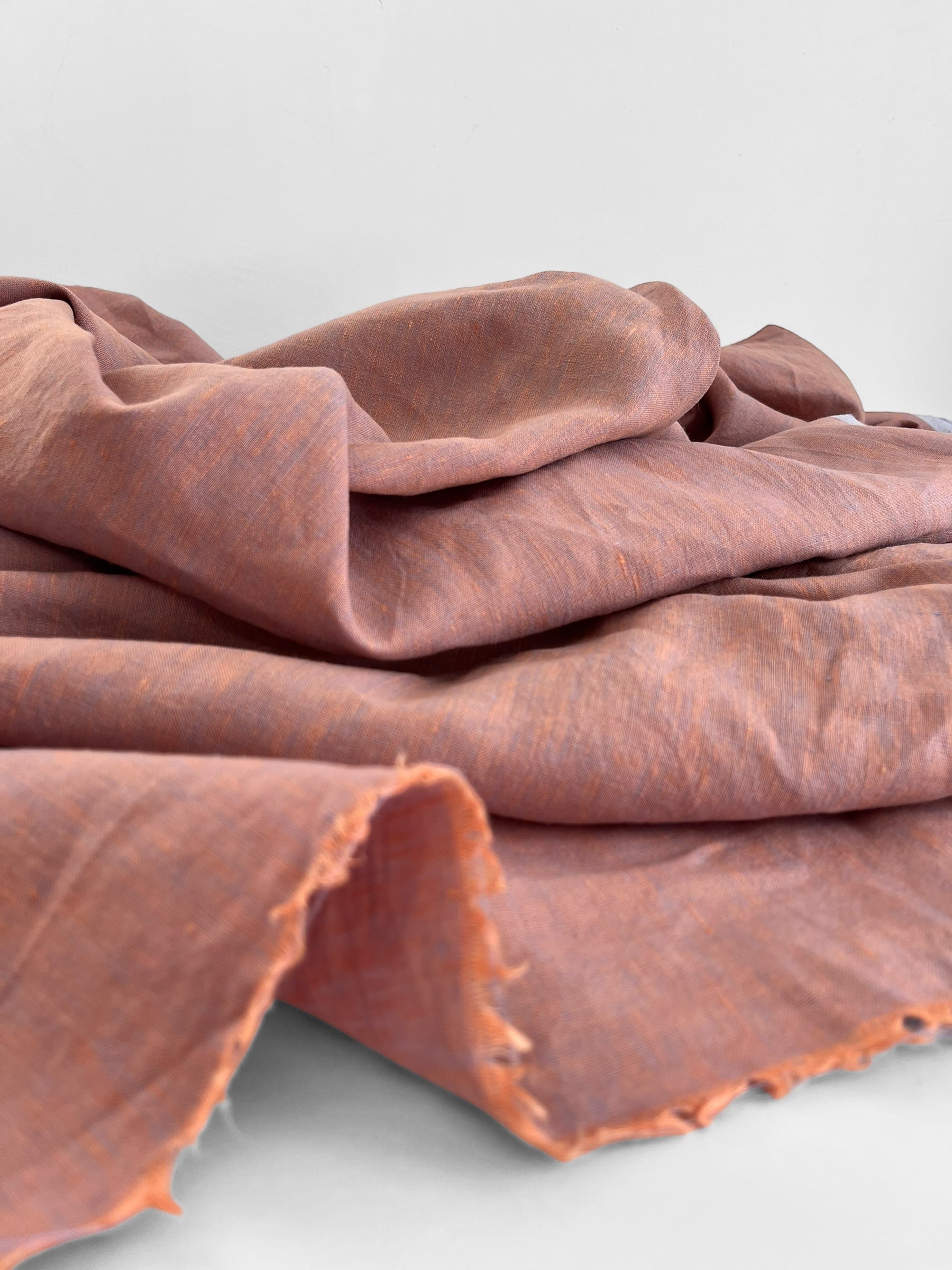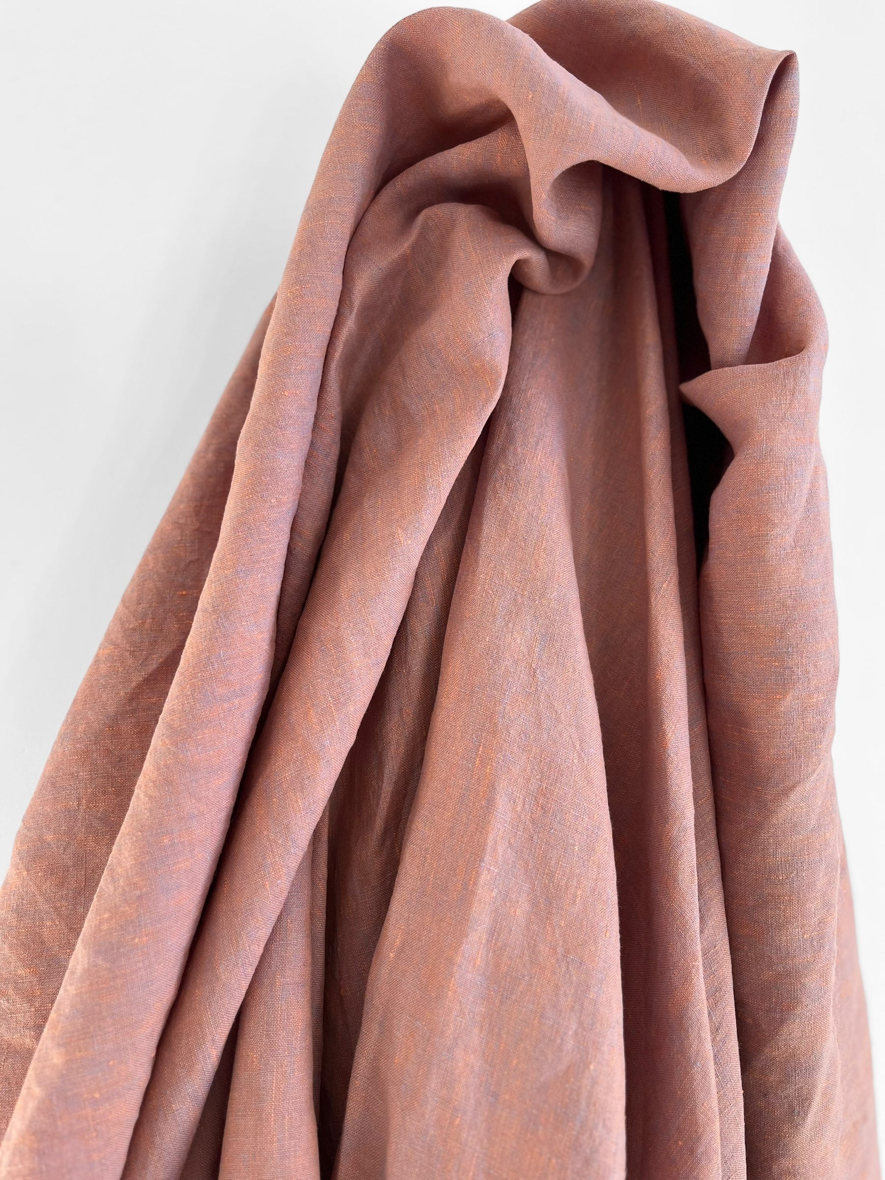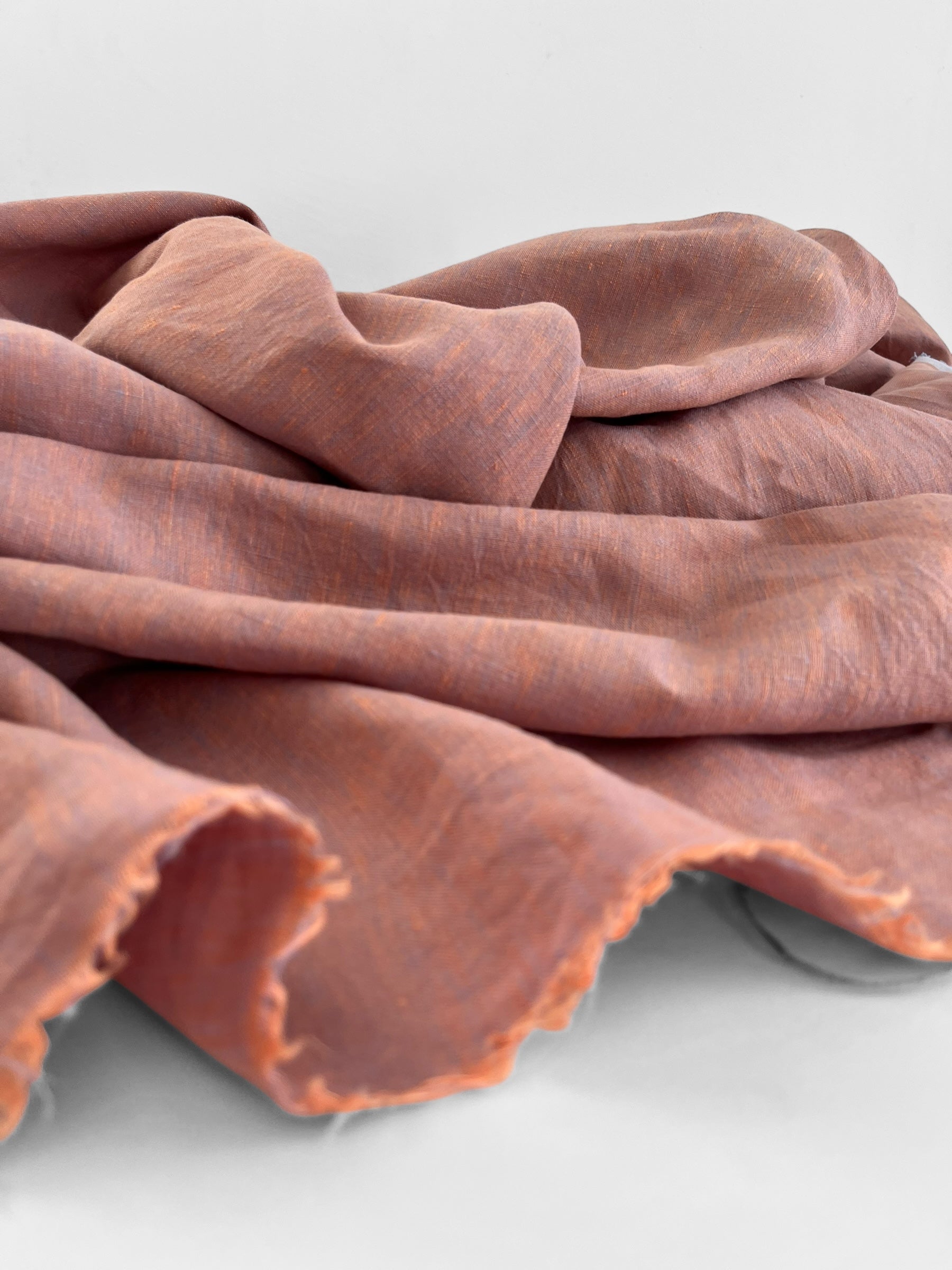 Premium quality linen/hemp blend woven out of two coloured yarn creating a unique melange look. Colours include coral orange and lavender purple.