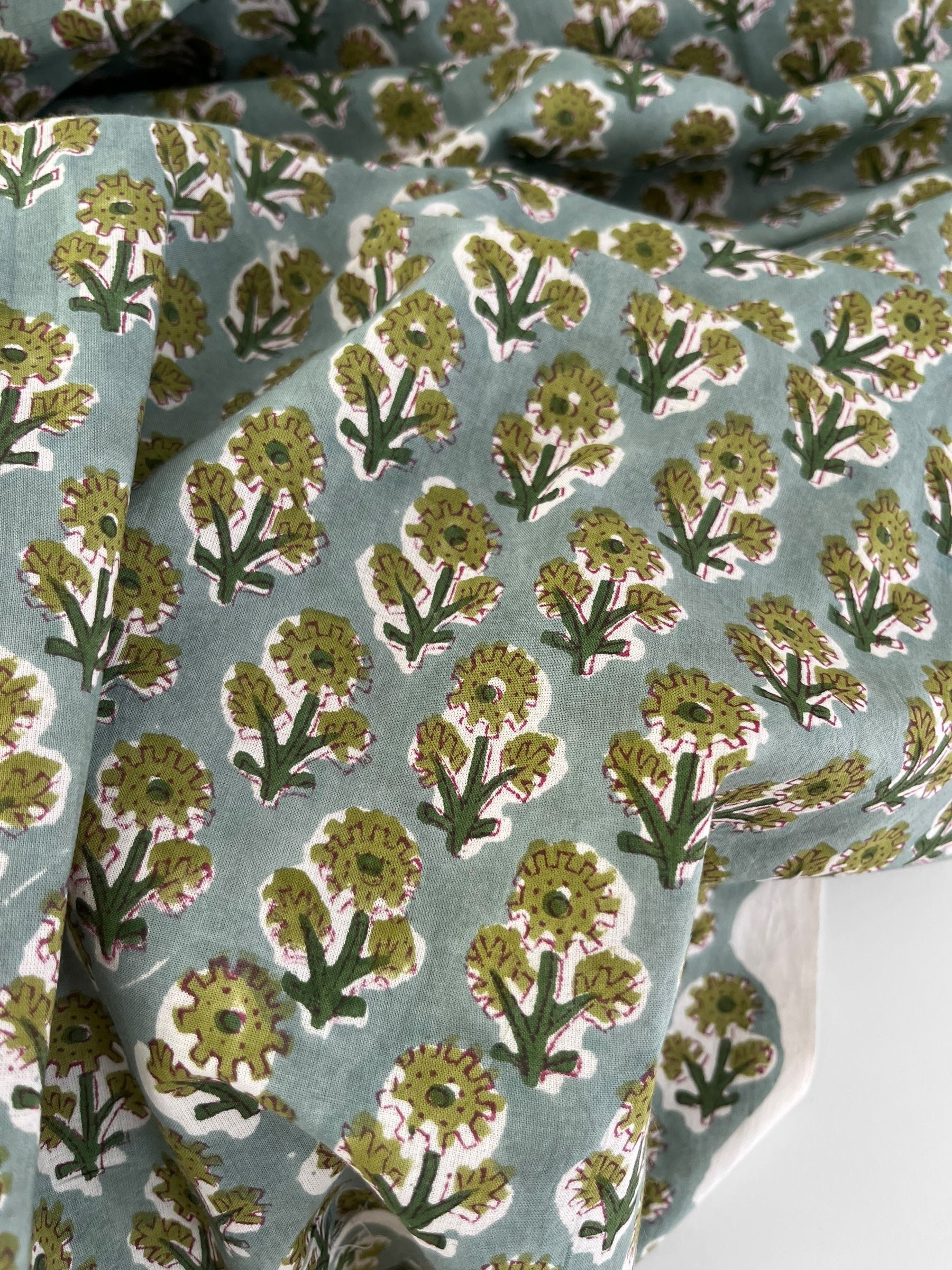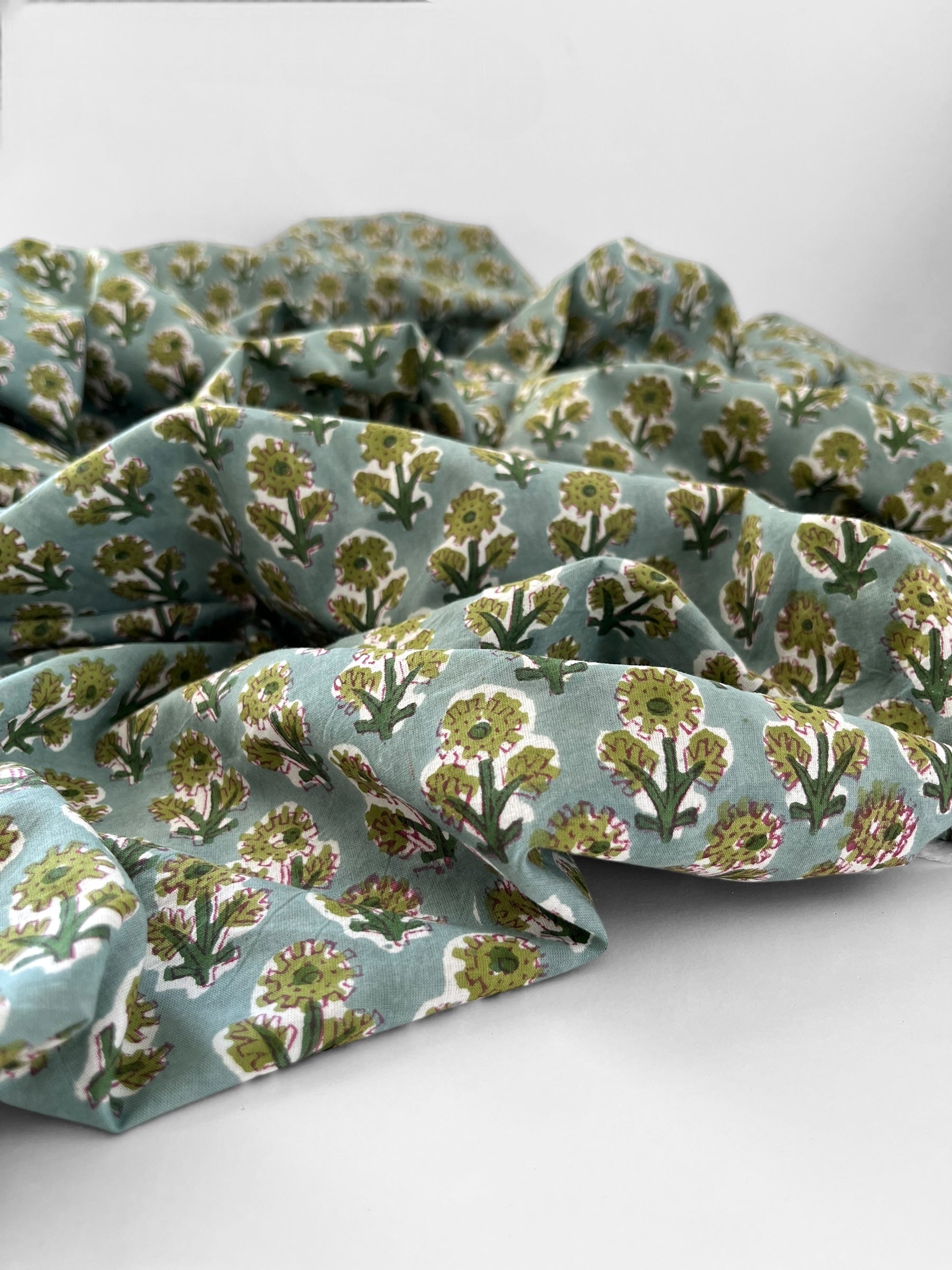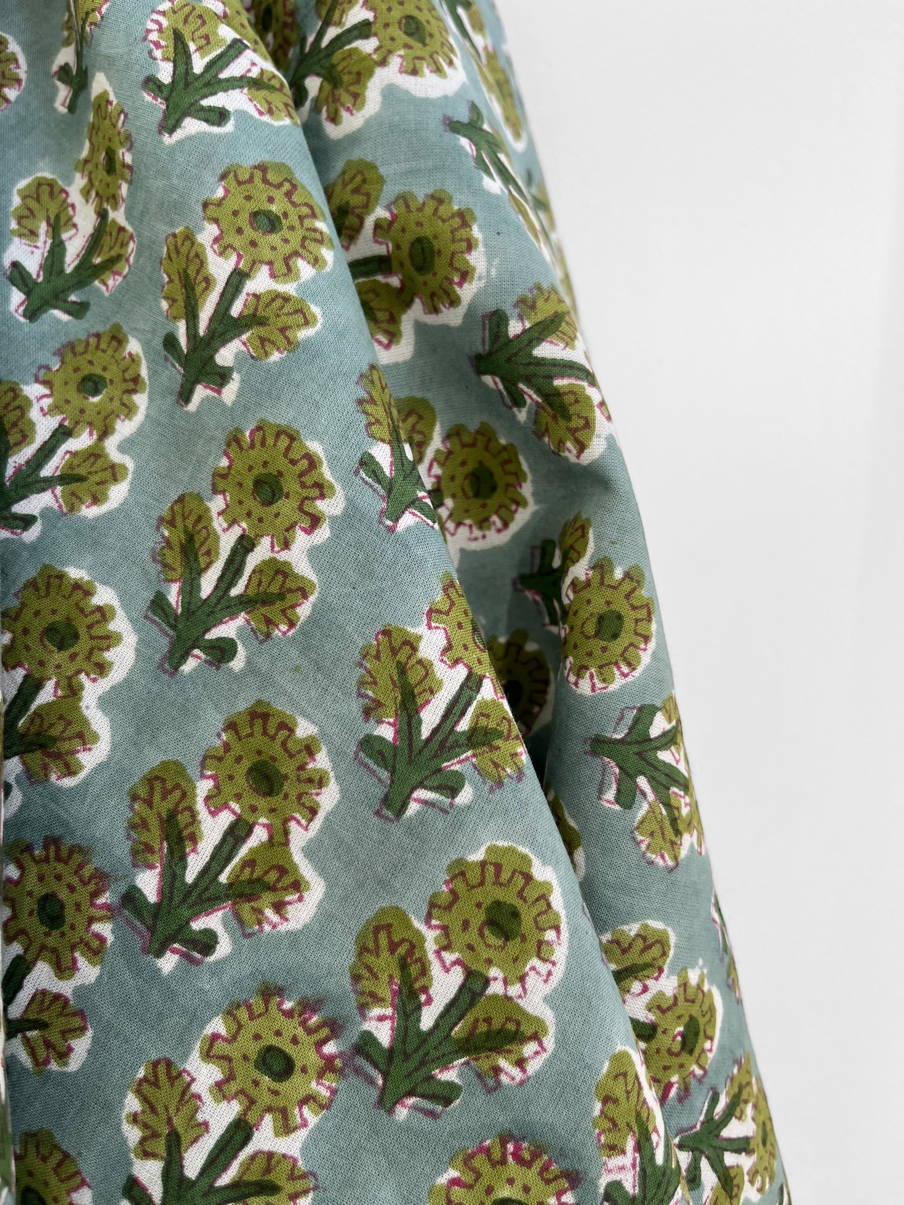 A cheerful floral block print handcrafted by artisans in Jaipur, India, utilising traditional processes and natural colours.