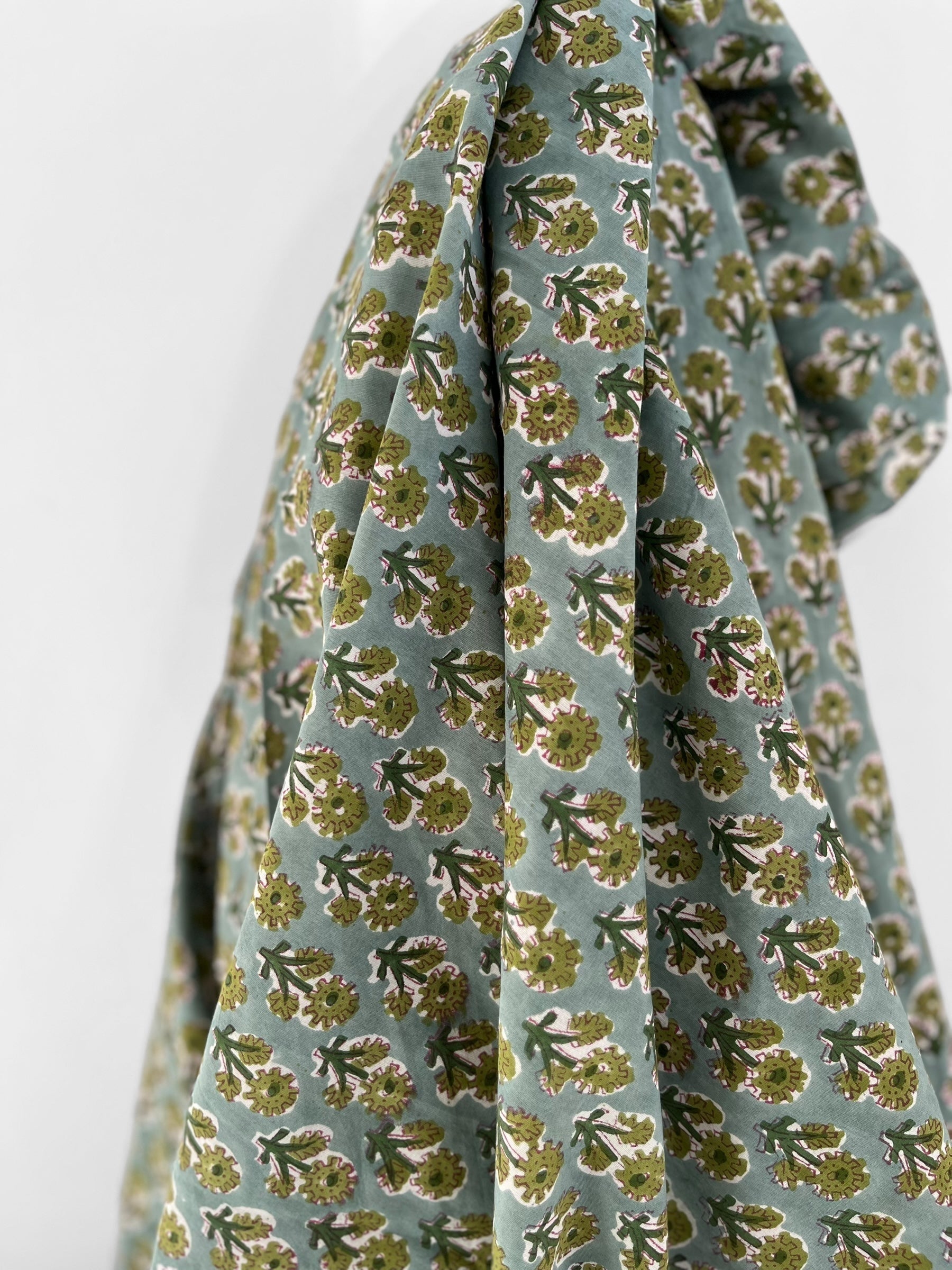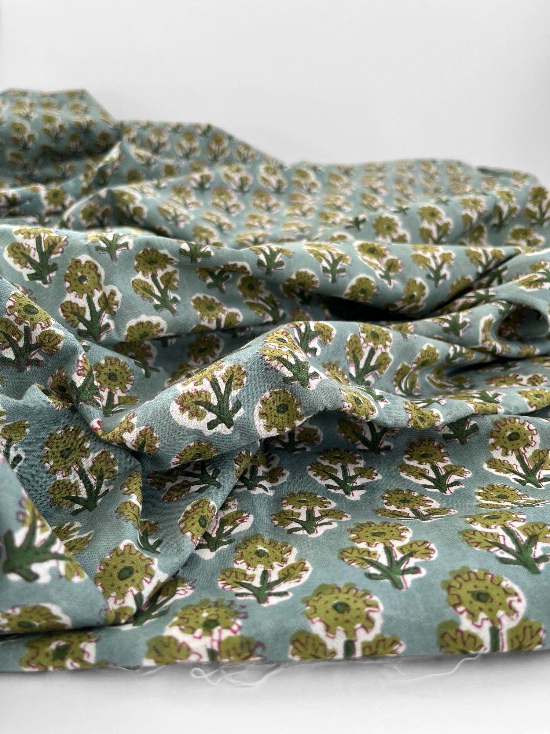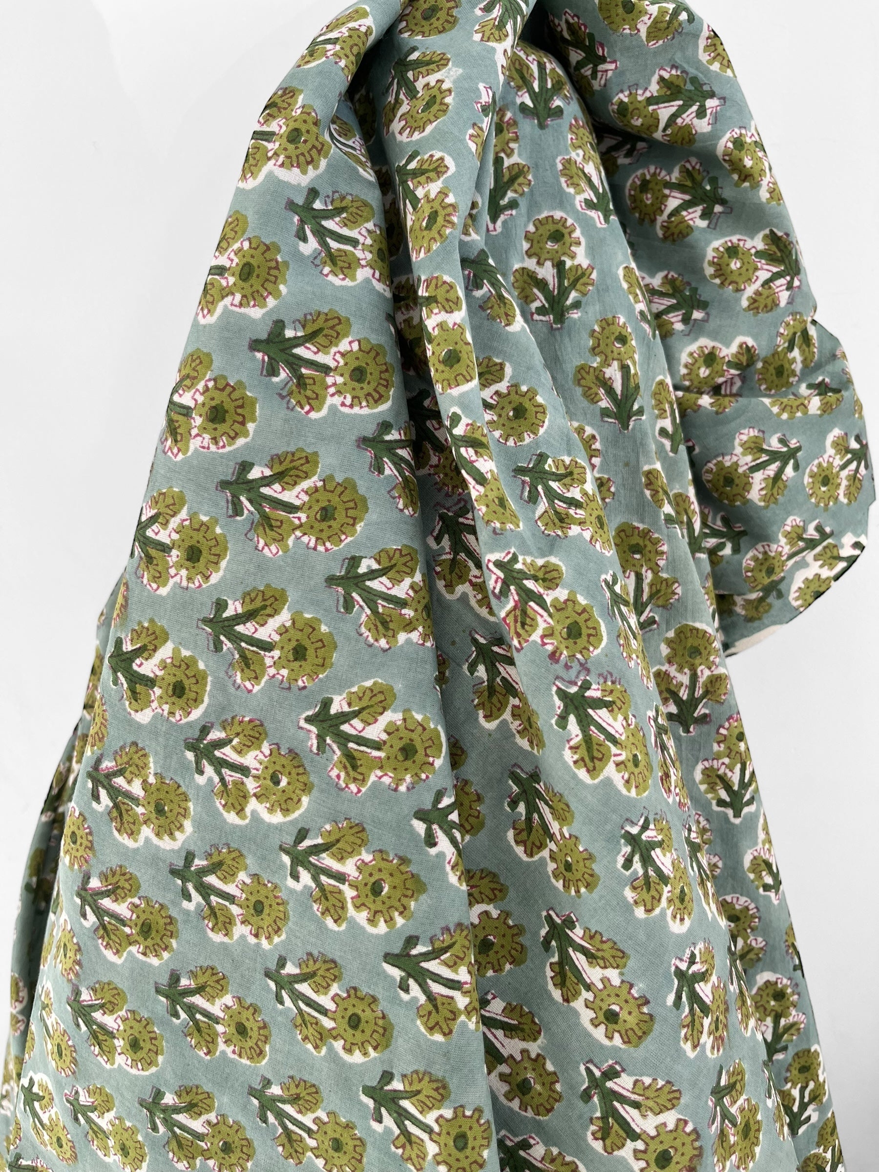 A cheerful floral block print handcrafted by artisans in Jaipur, India, utilising traditional processes and natural colours.