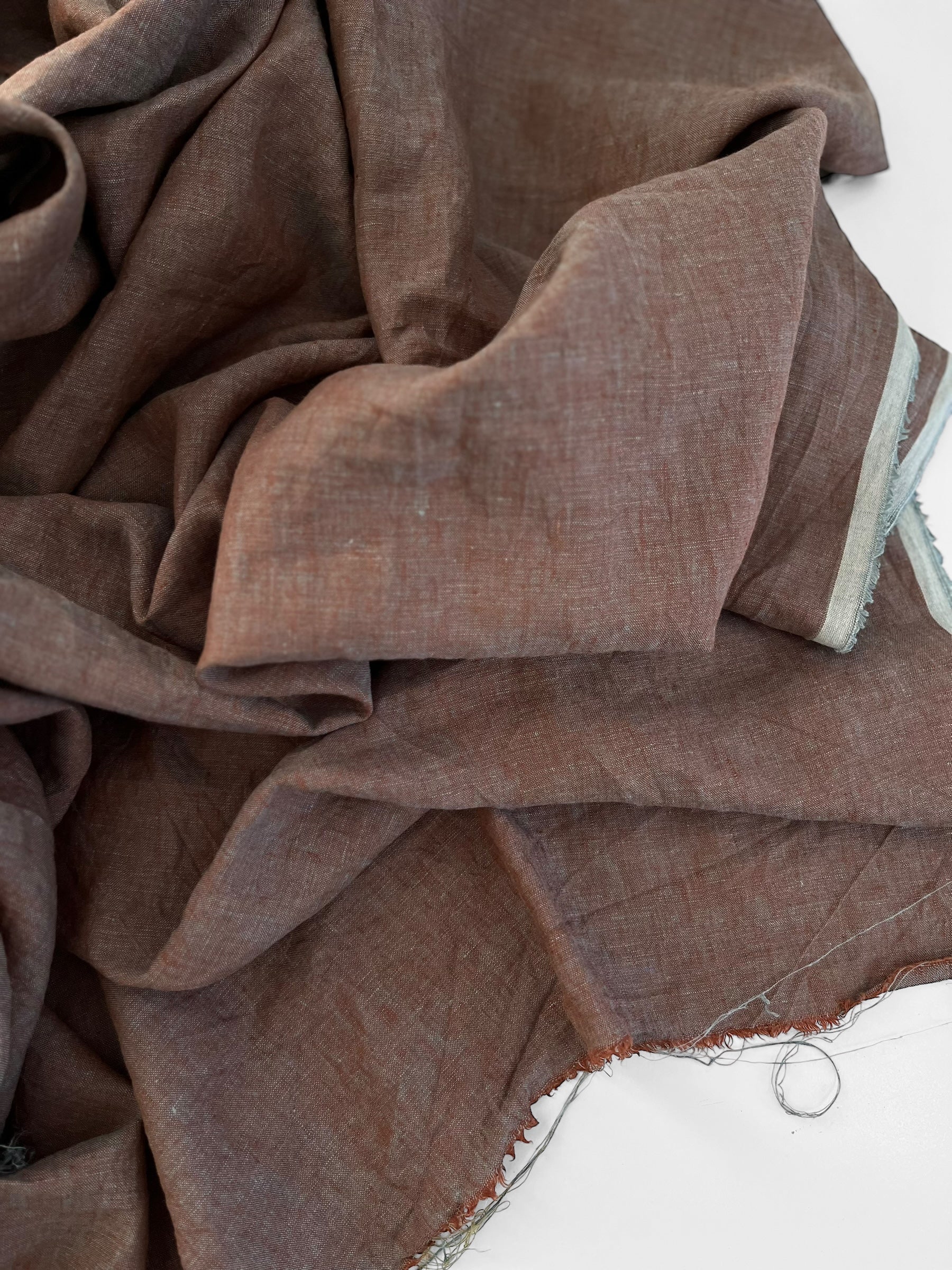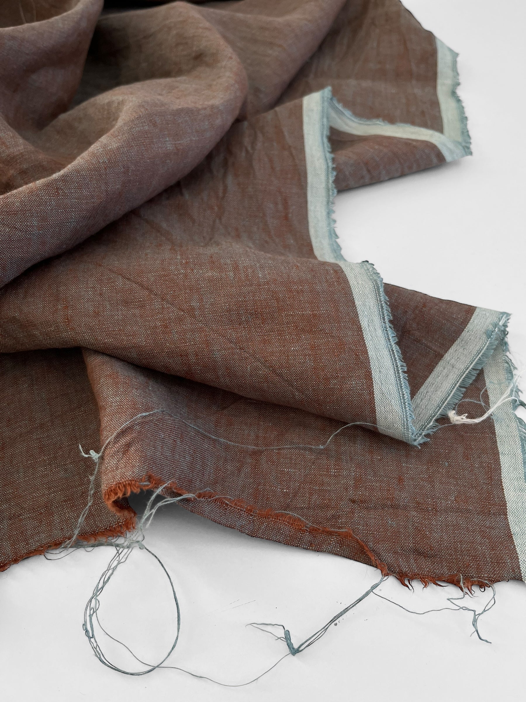 Premium quality linen/hemp blend woven out of two coloured yarn creating a unique melange look. Colours include a chestnut brown and an aqua blue.