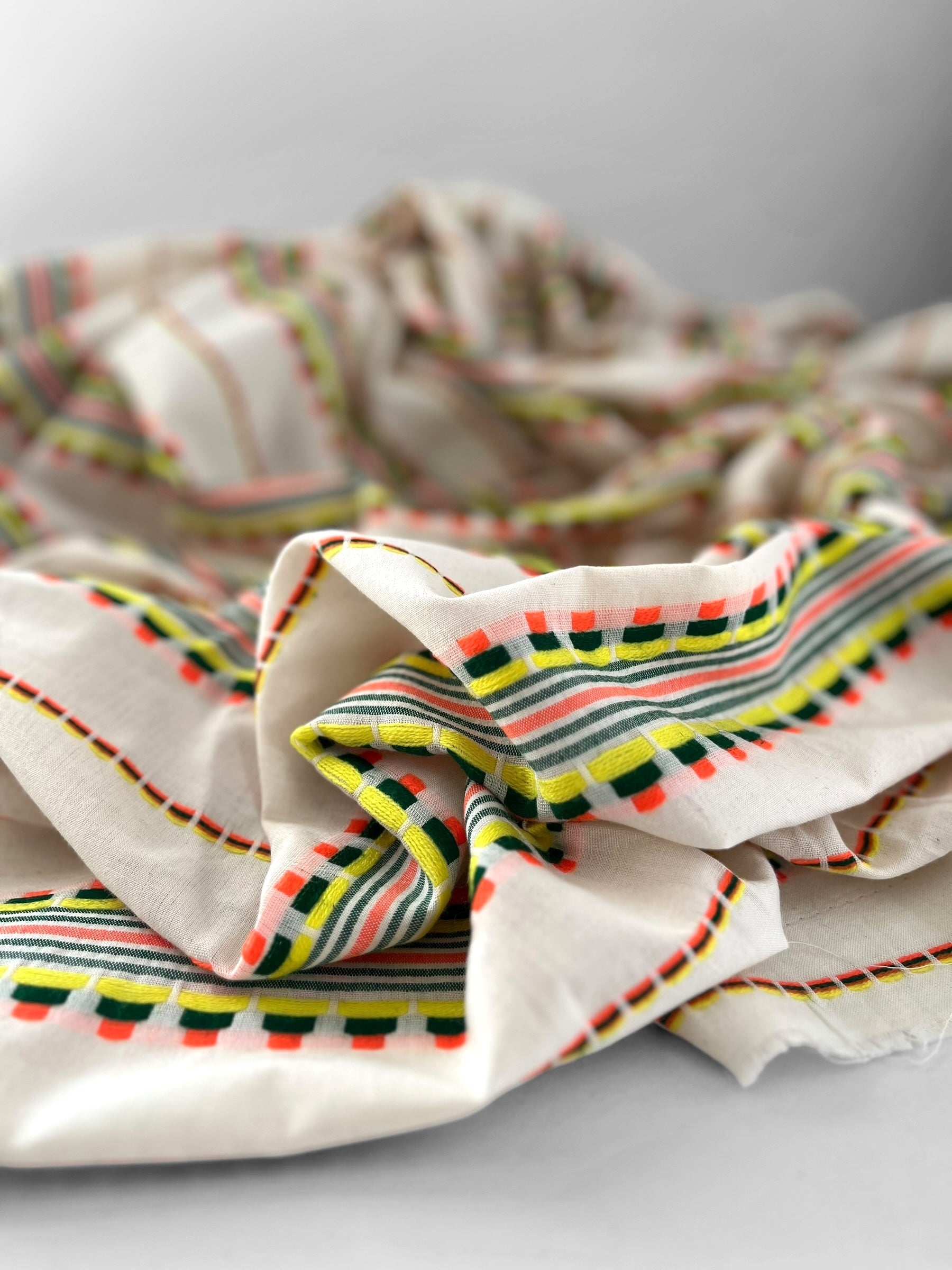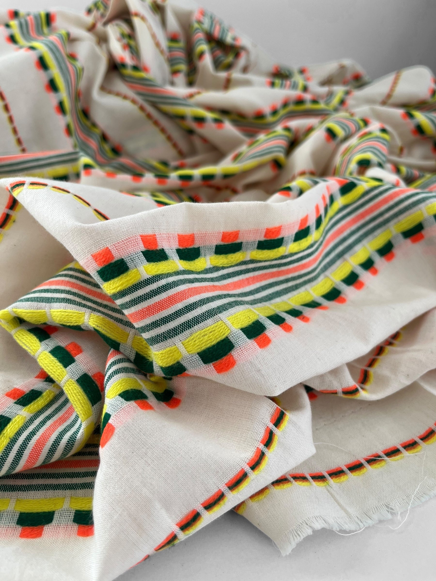 This cloth is bringing the sunshine! A vibrant soft cotton dobby design with pops of orange, yellow and green.