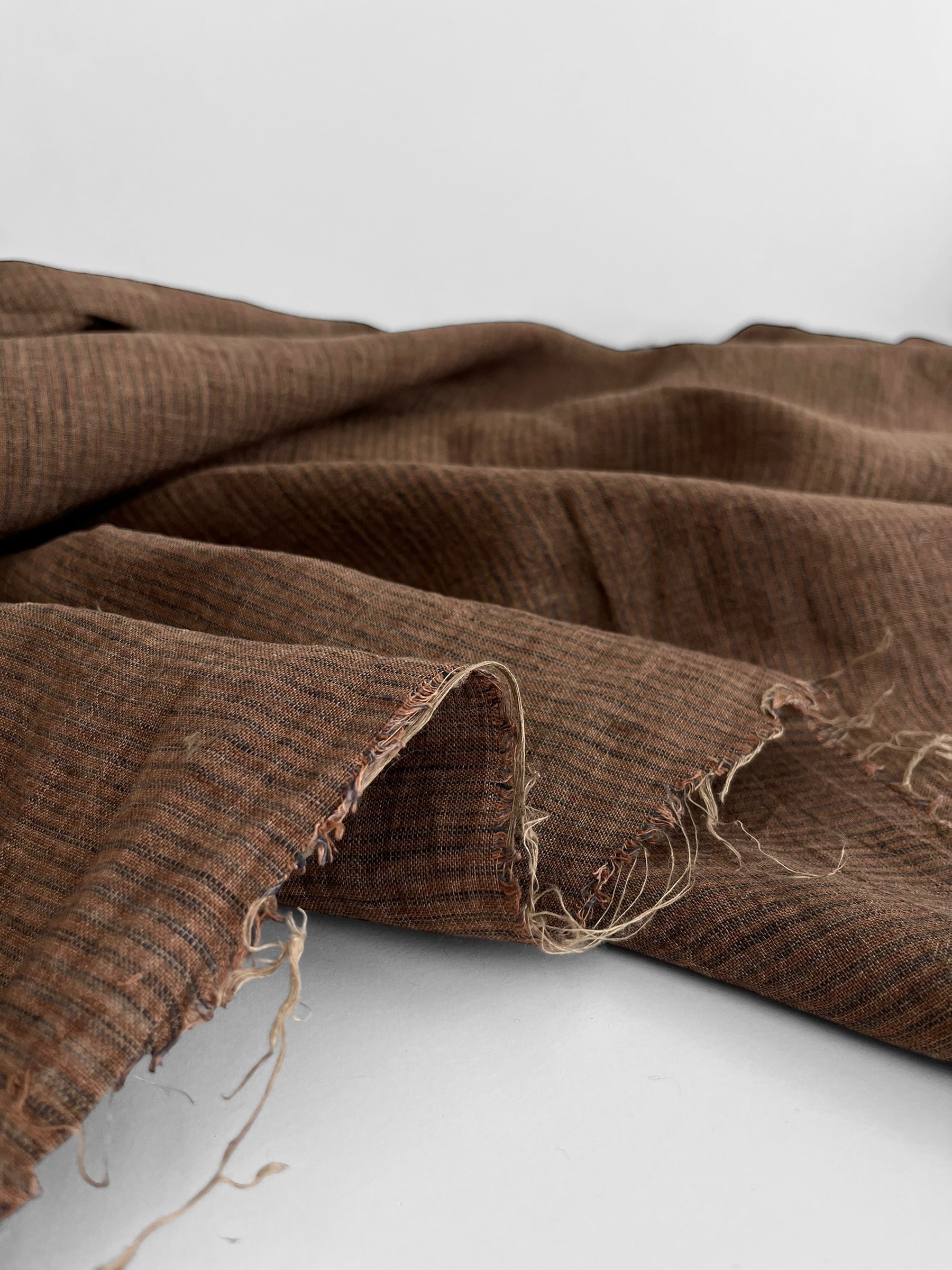 Pure yarn dyed linen, stonewashed at the mill giving it softness and a relaxed worn-in look. the colours include subtle navy blue track stripes on a mid brown background.