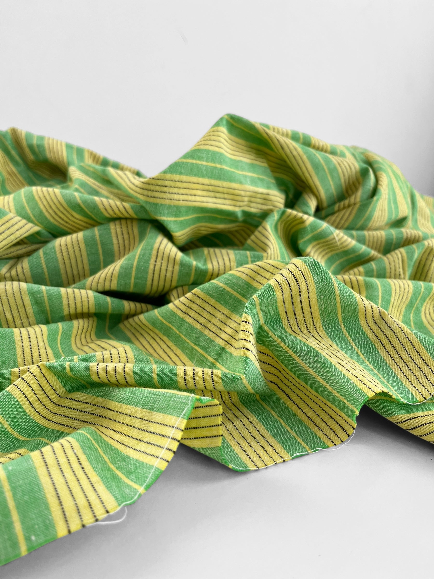 A beautifully soft premium cotton handwoven in rural Bengal, India, featuring a timeless yet unique stripy pattern. The colours include a yellow, green and touches of black.