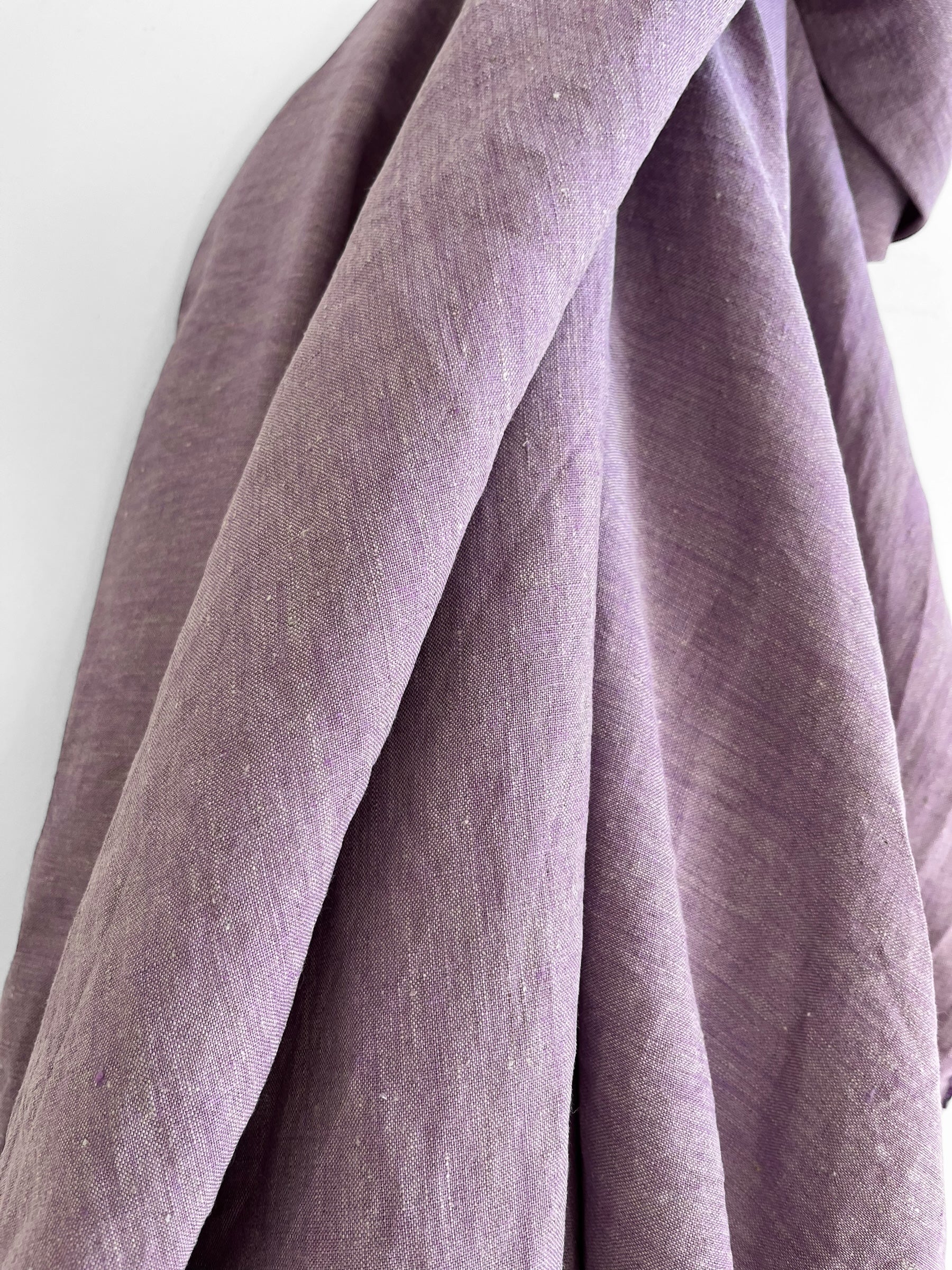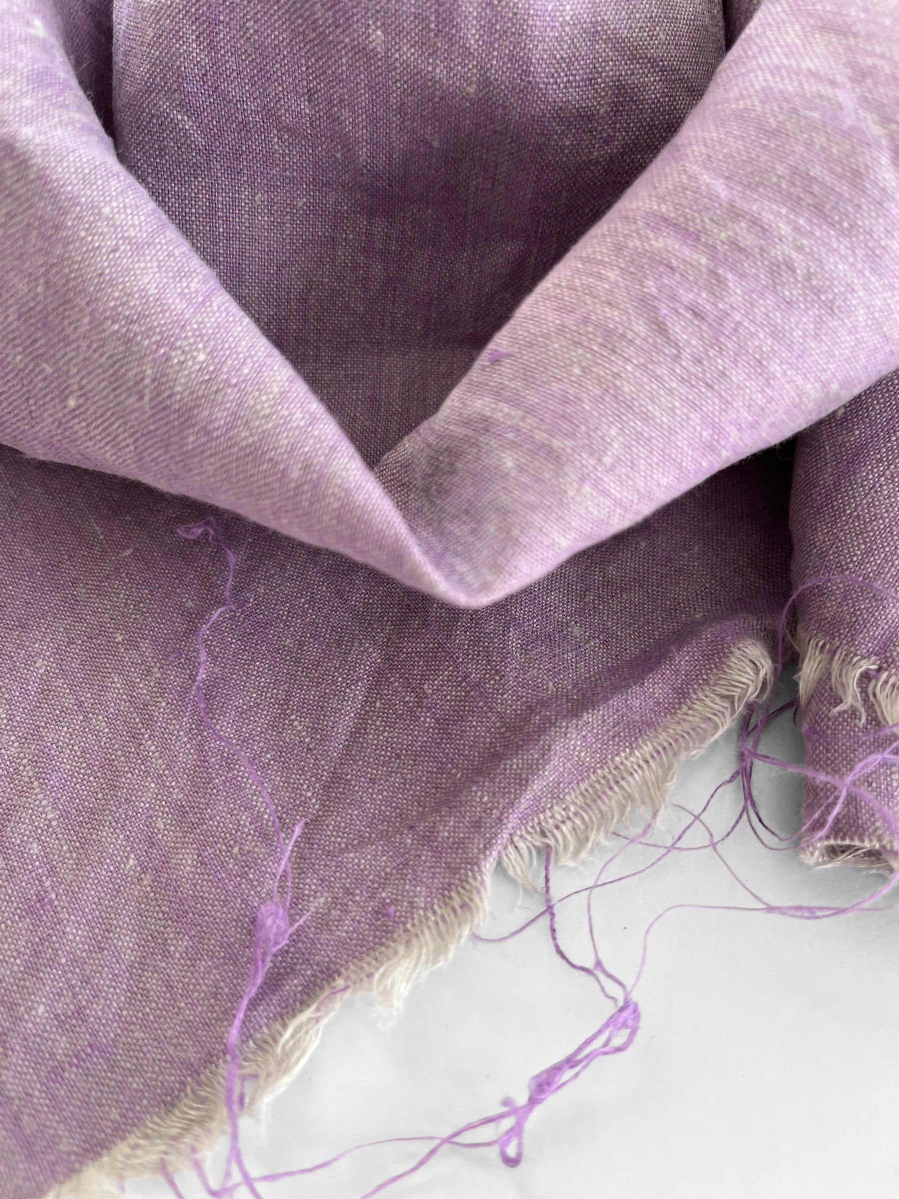 Premium quality linen/hemp blend woven out of two coloured yarn creating a unique melange look. Colours include lilac purple and natural/off white.