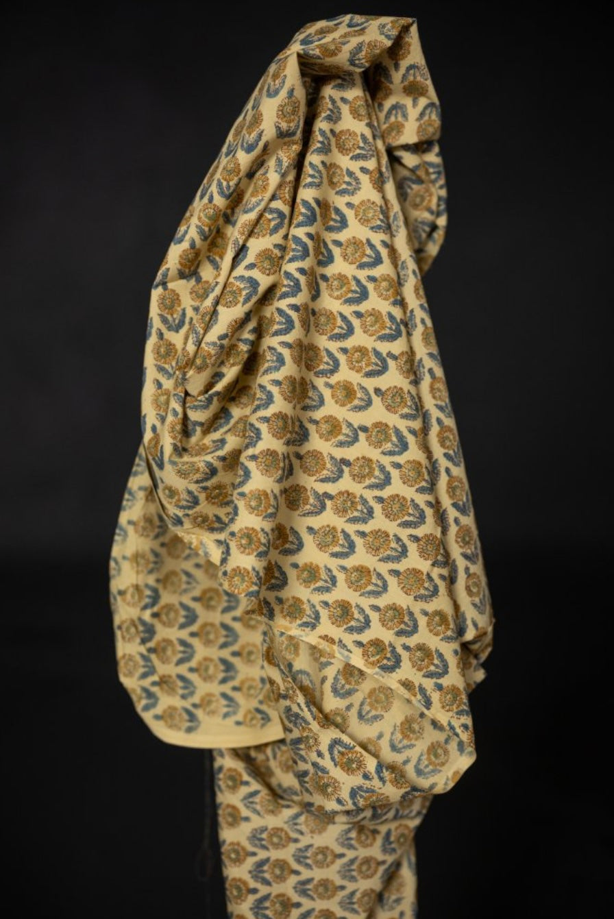 Vintage style Indian block print in warm tones of yellow and blue.