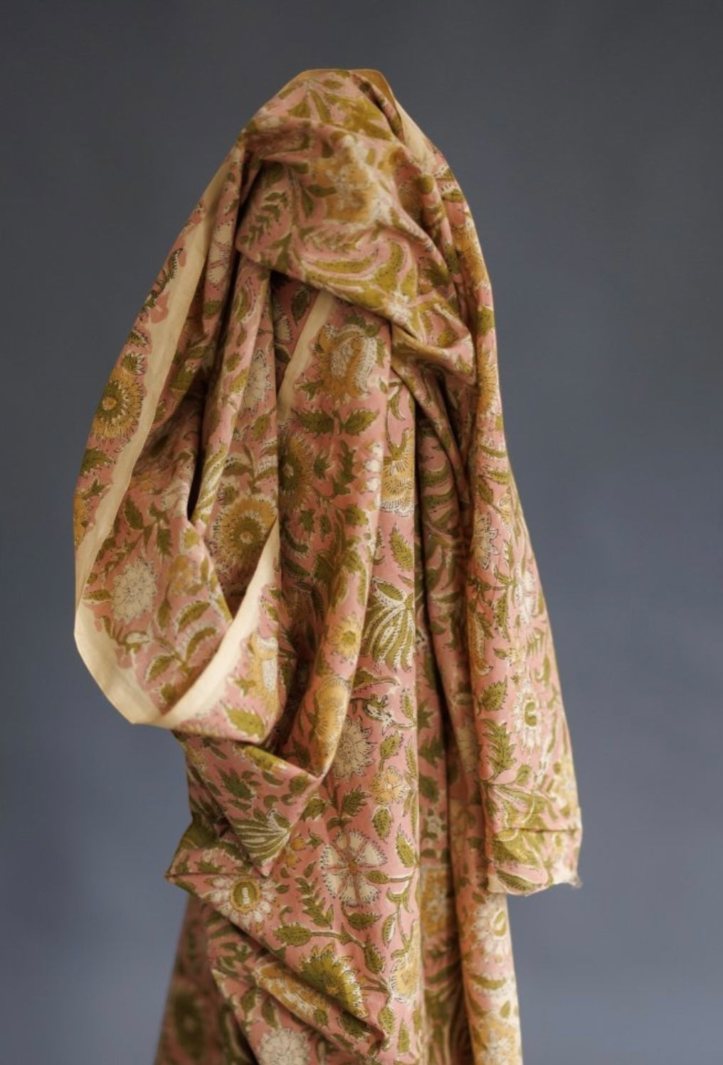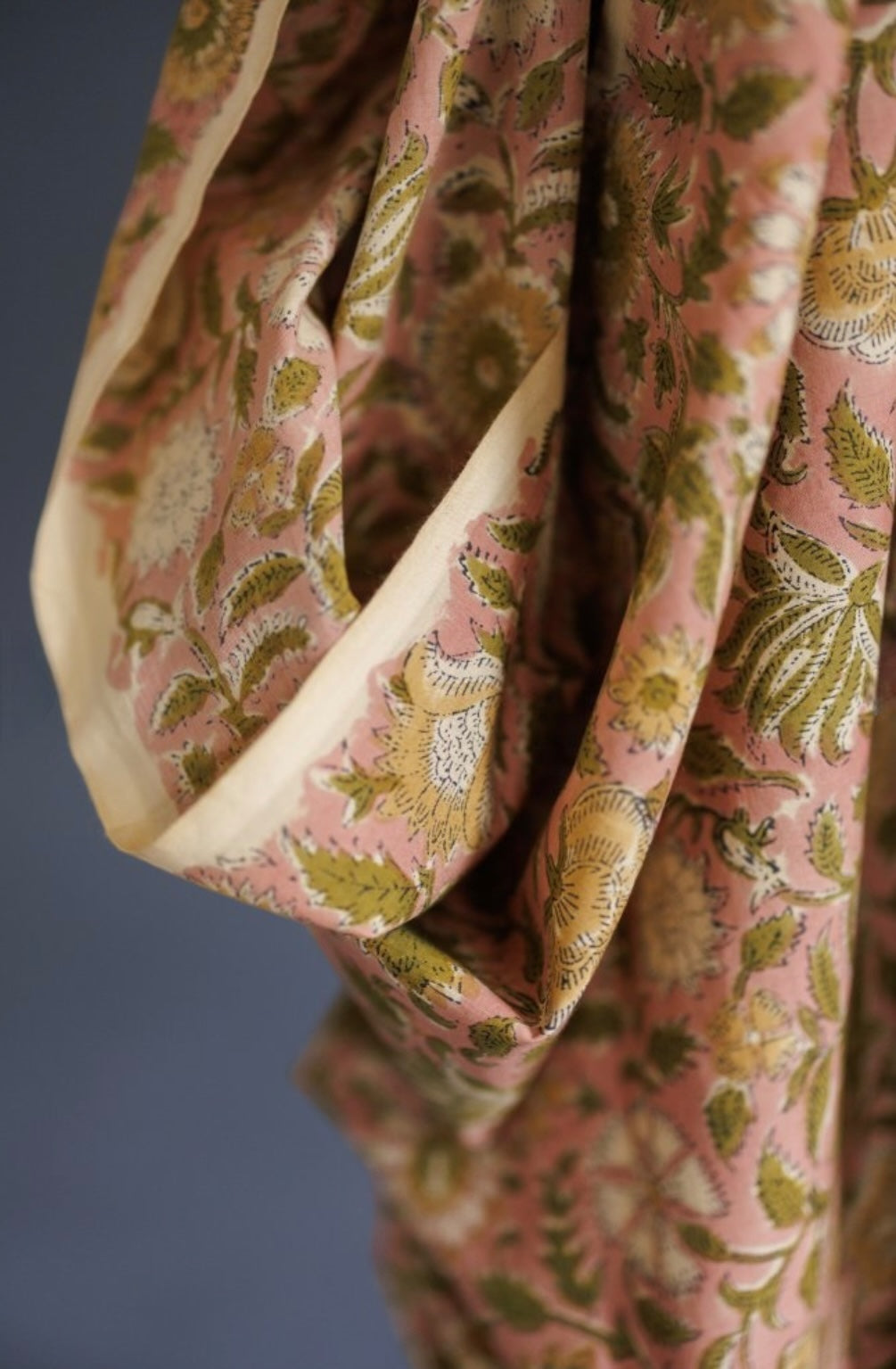 A delicate and pretty Indian blockprint in tones of pink, green and mustard.