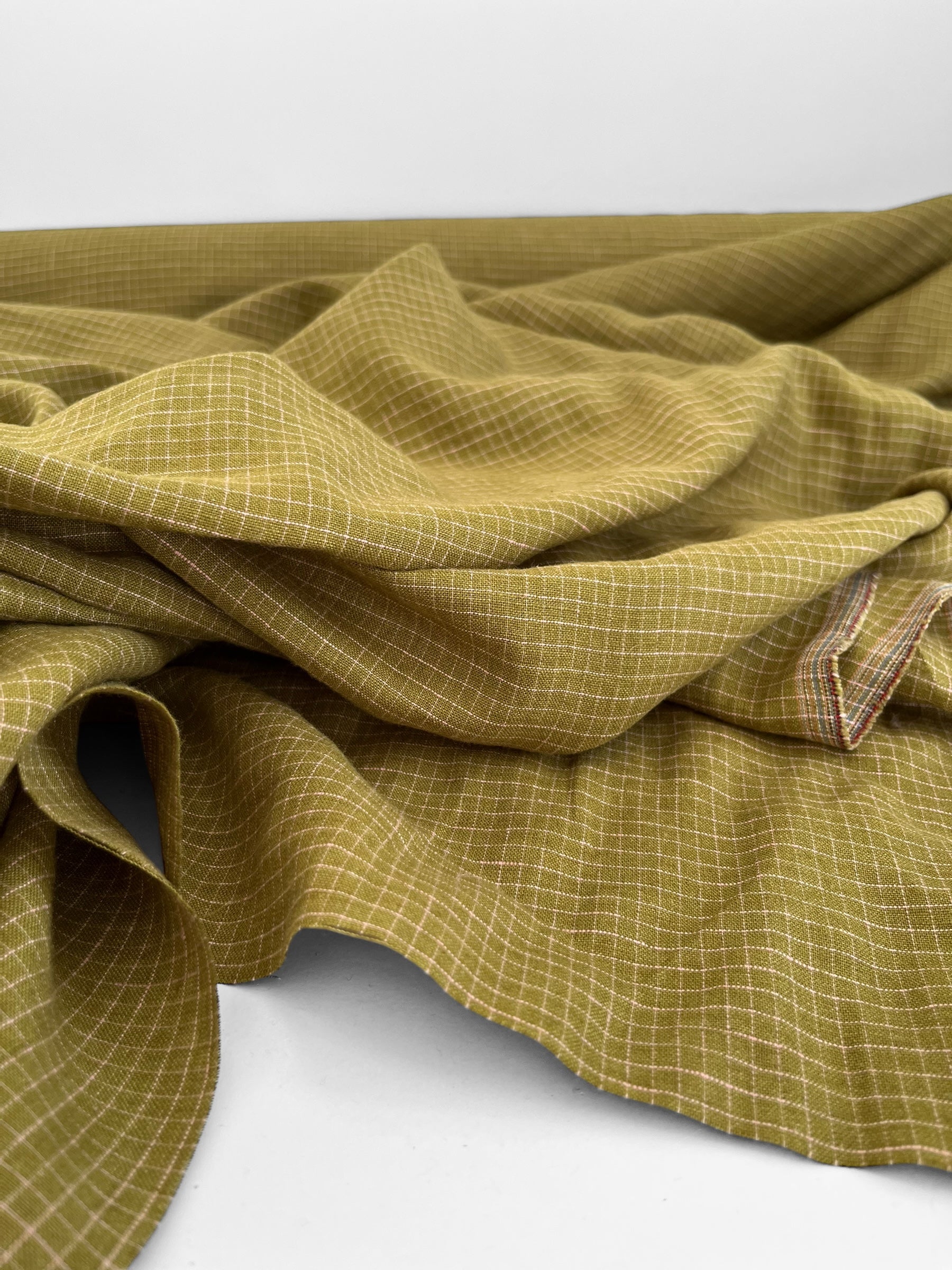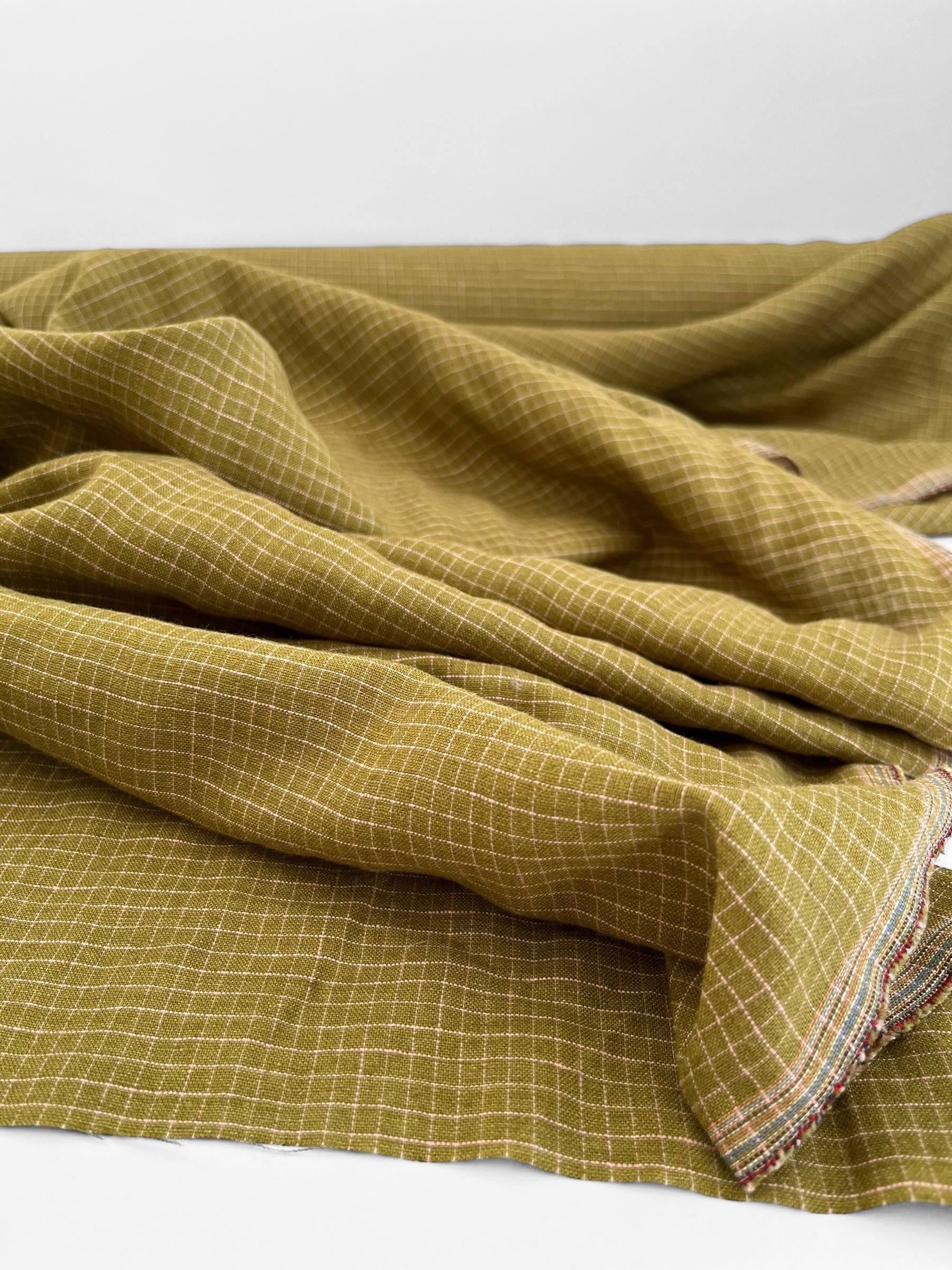 Beautifully soft linen/cotton blend in a vibrant moss green colour with lilac yarn running through to create a subtle grid