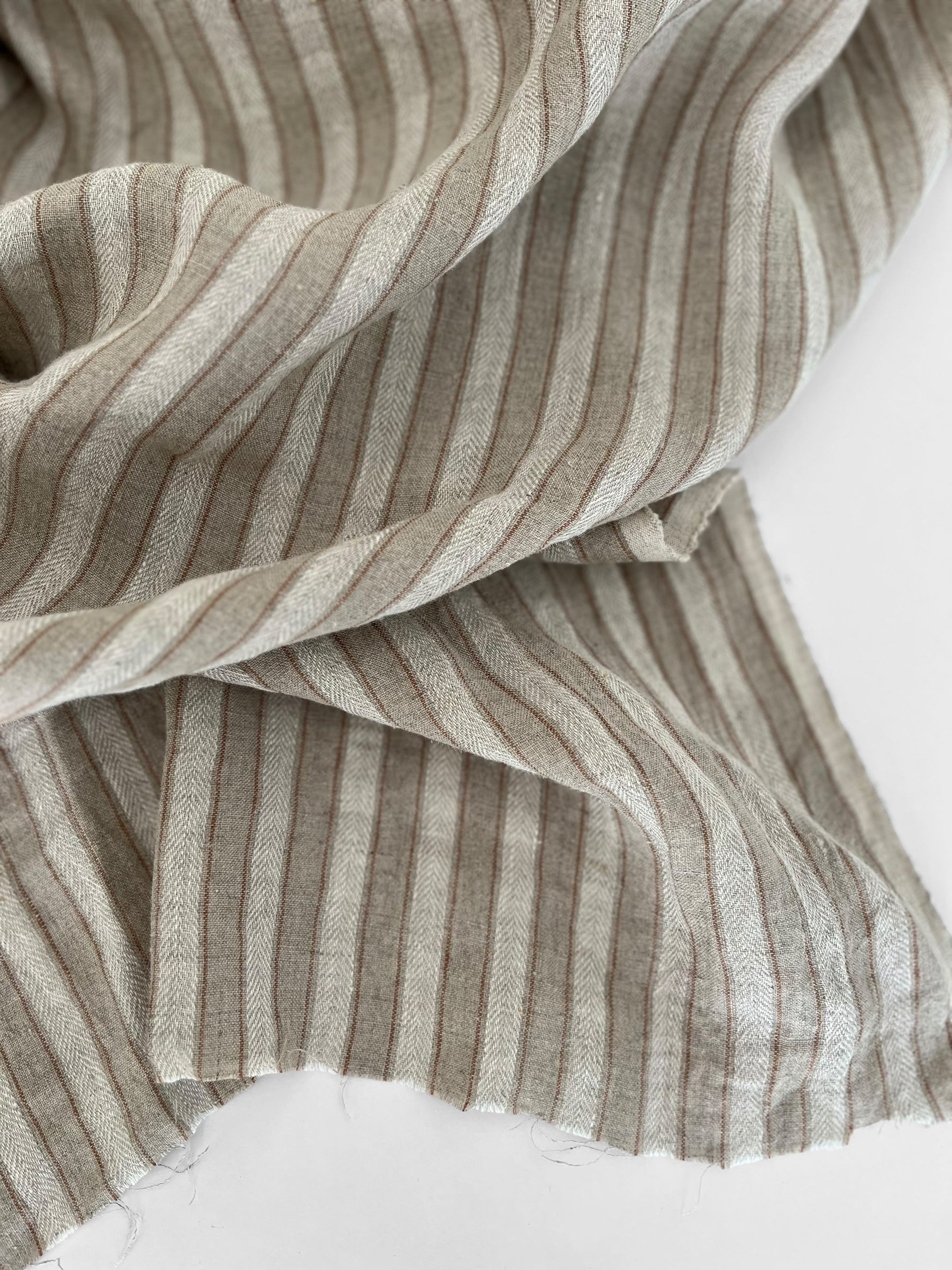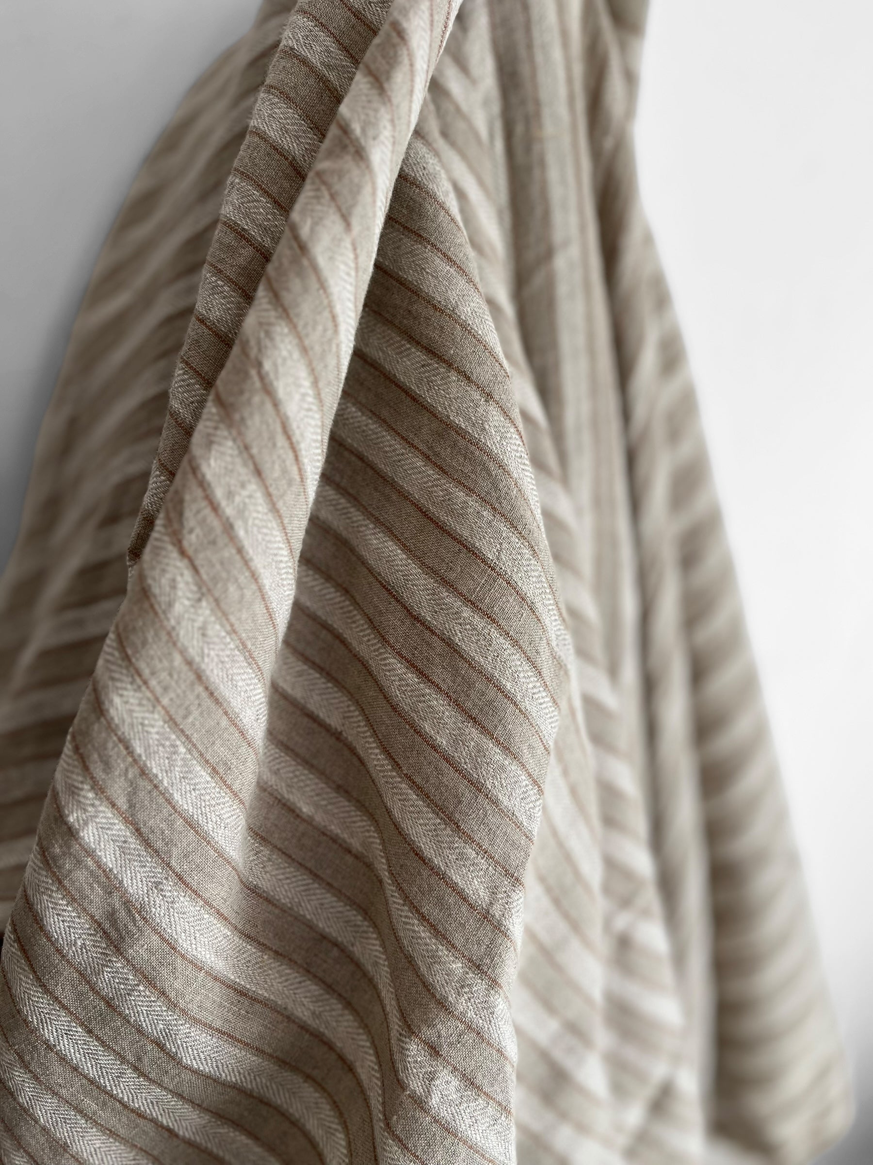 The main centre stripe measures ca. 1cm and features a subtle herringbone texture. It is flanked by two delicate pinstripes, creating a timeless look with a rustic feel. The colours include white (centre stripe), cinnamon brown (side pinstripes) and natural flax (background).
