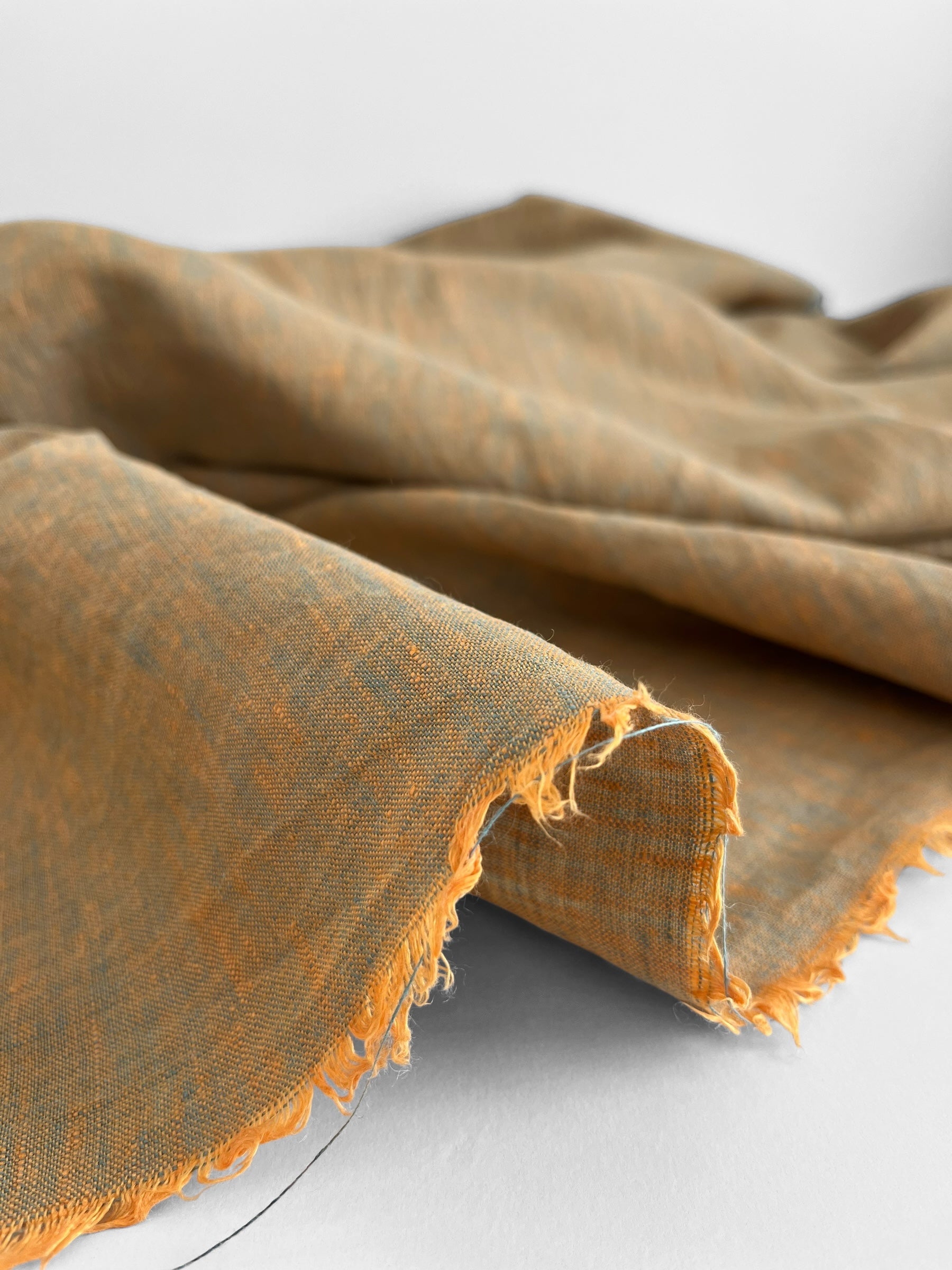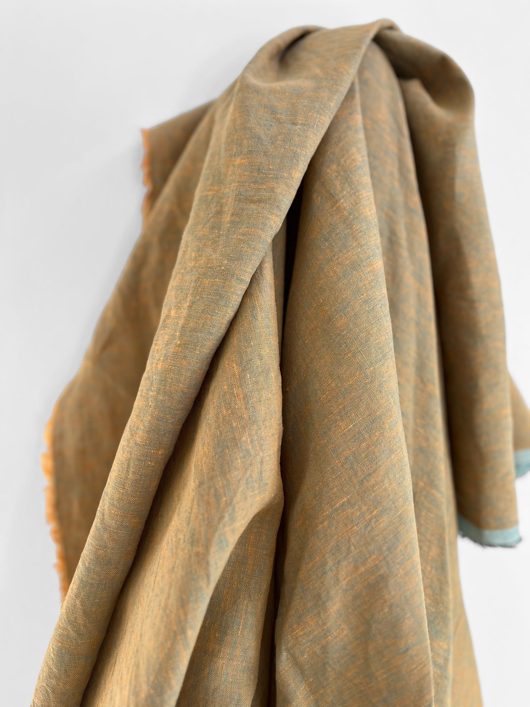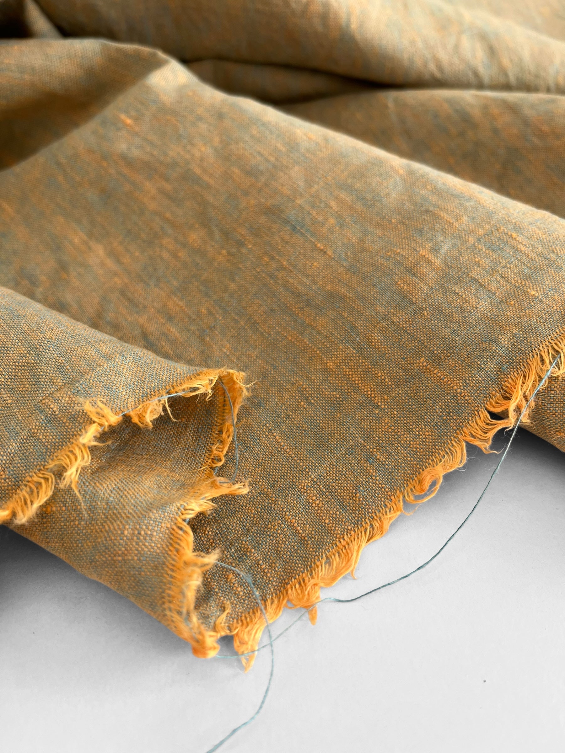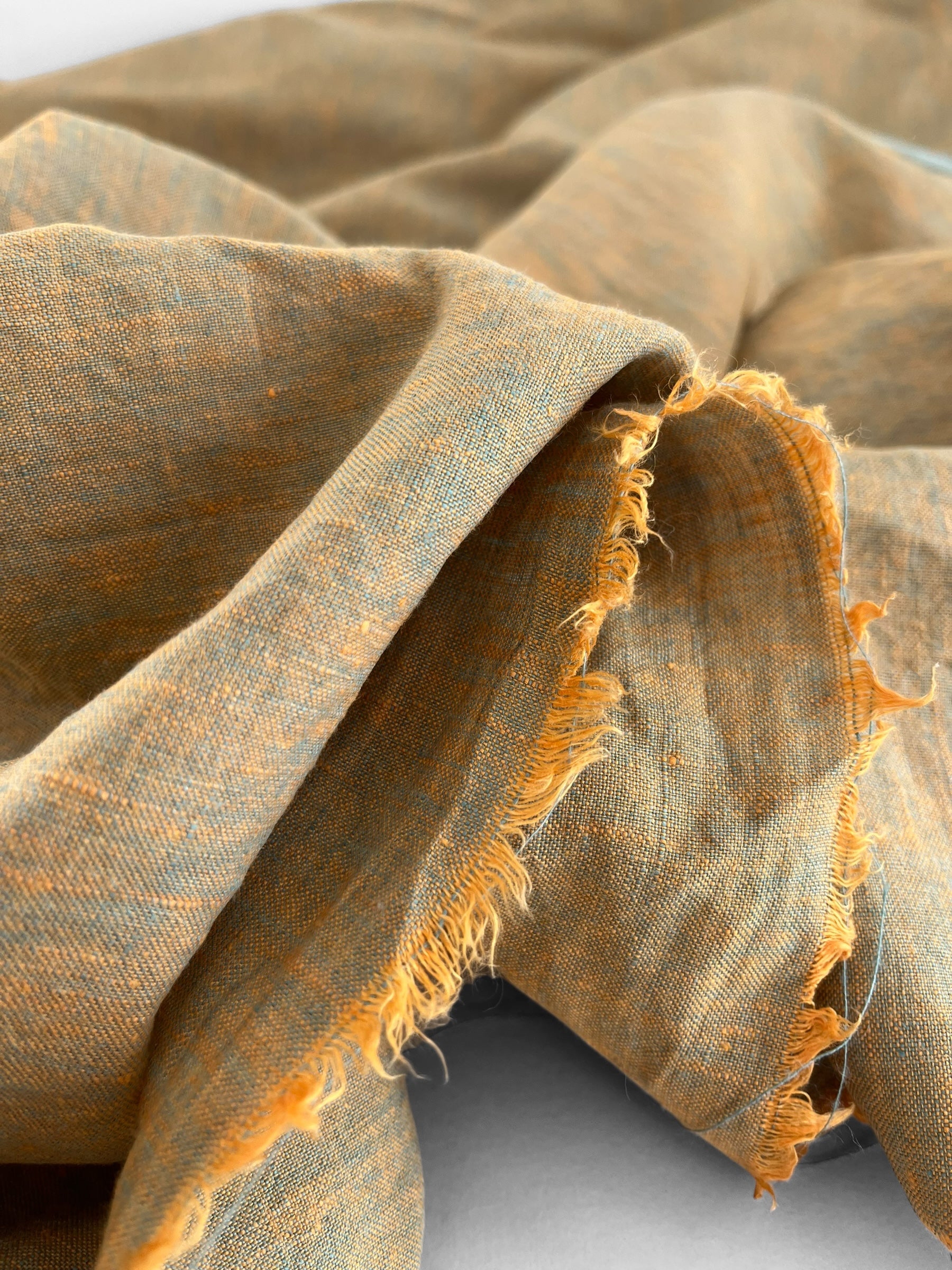 Premium quality linen/hemp blend woven out of two coloured yarn creating a unique melange look. Colours include orange and aqua blue.