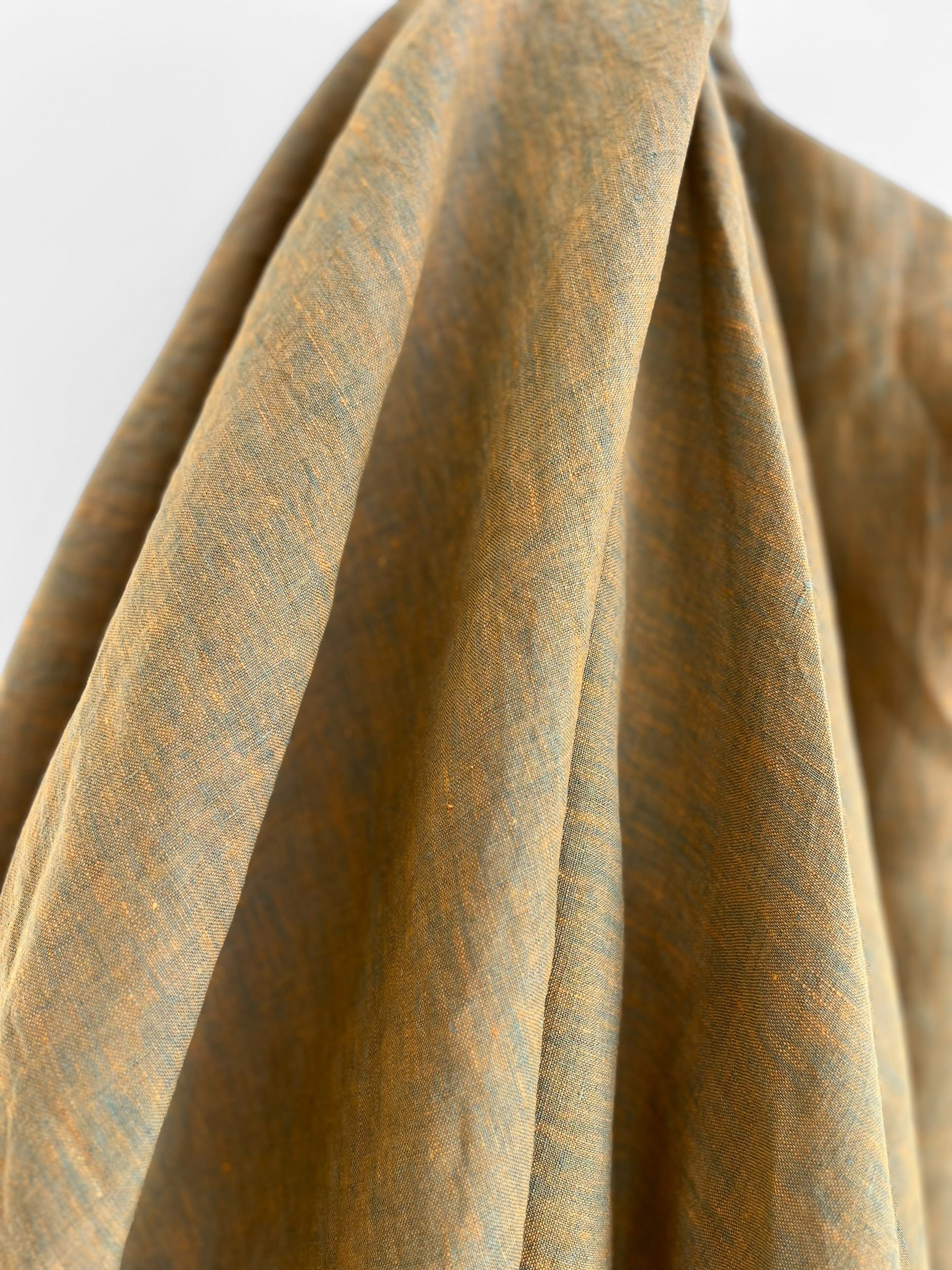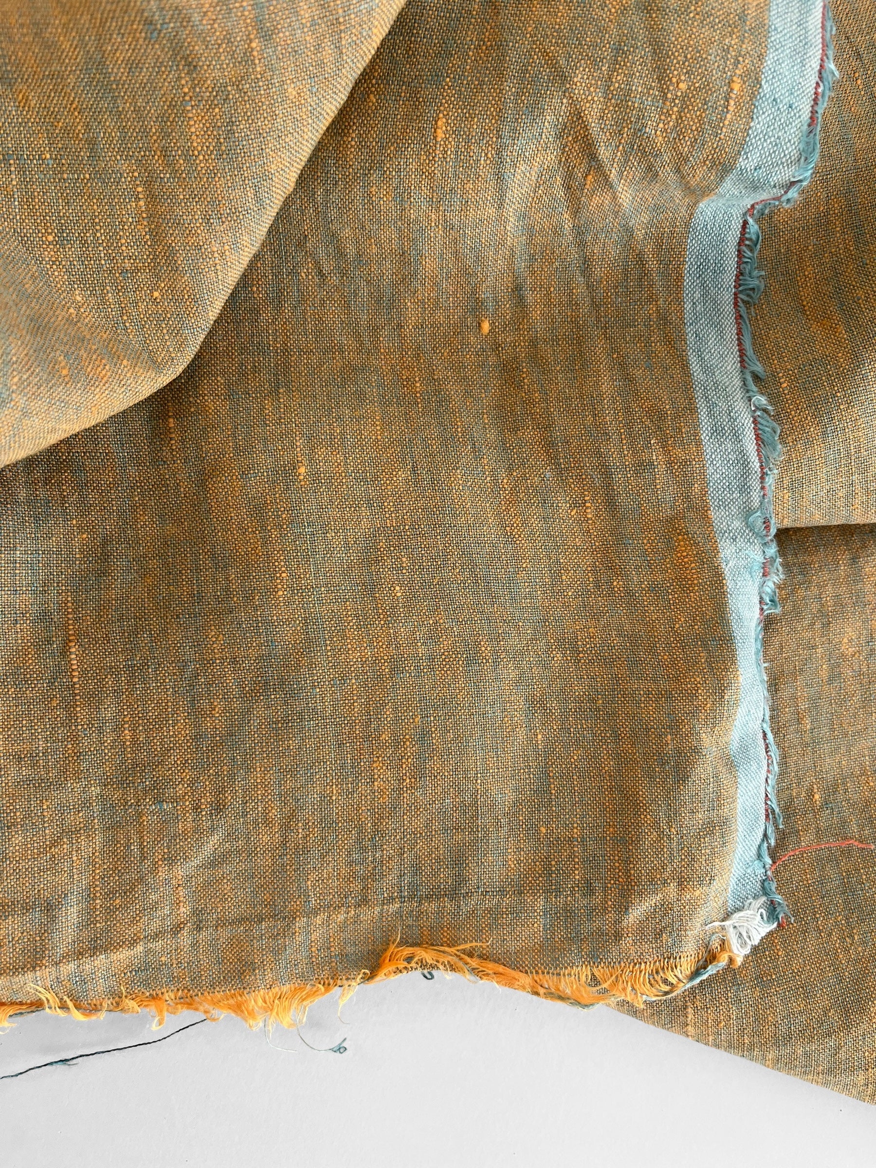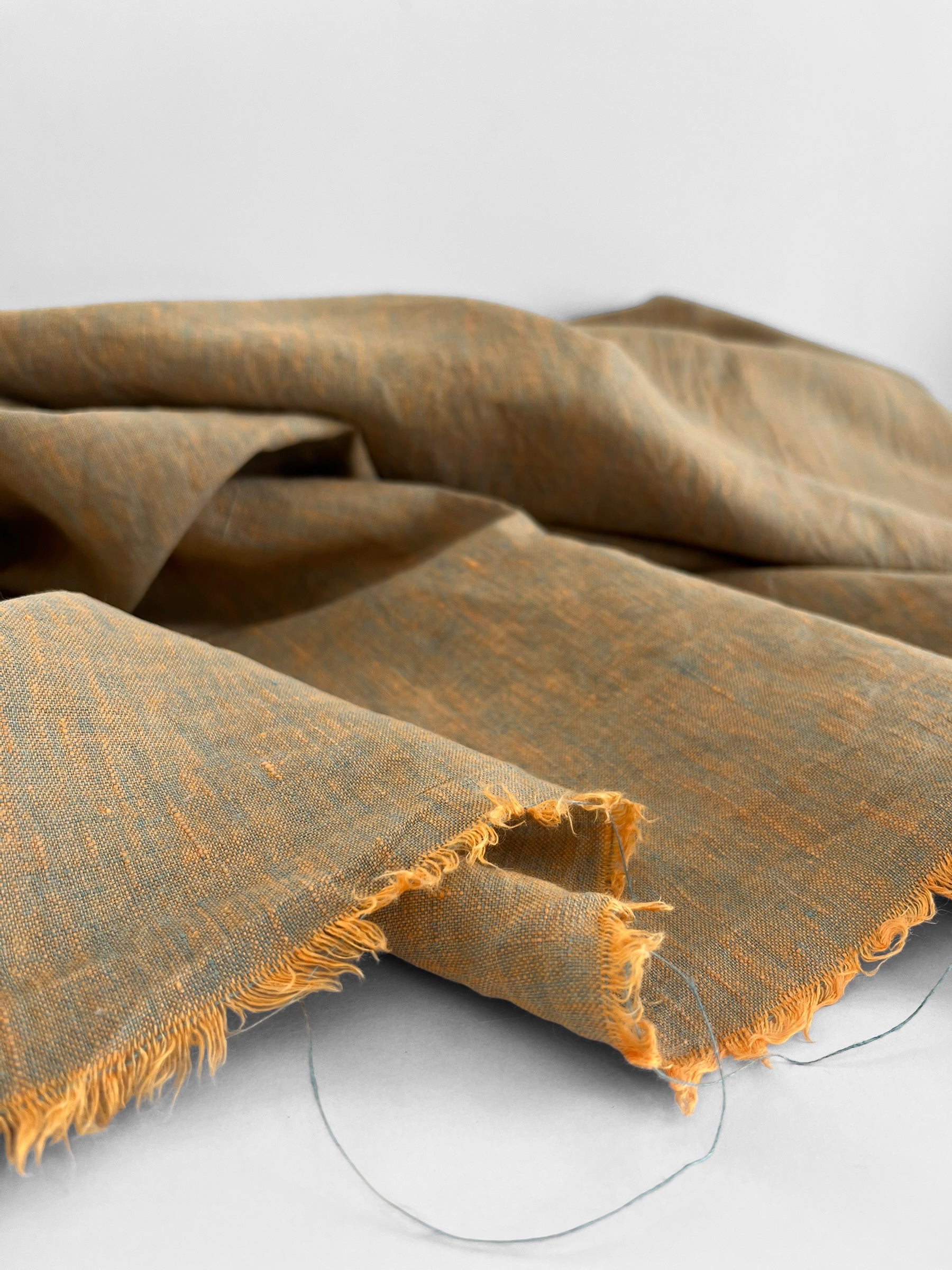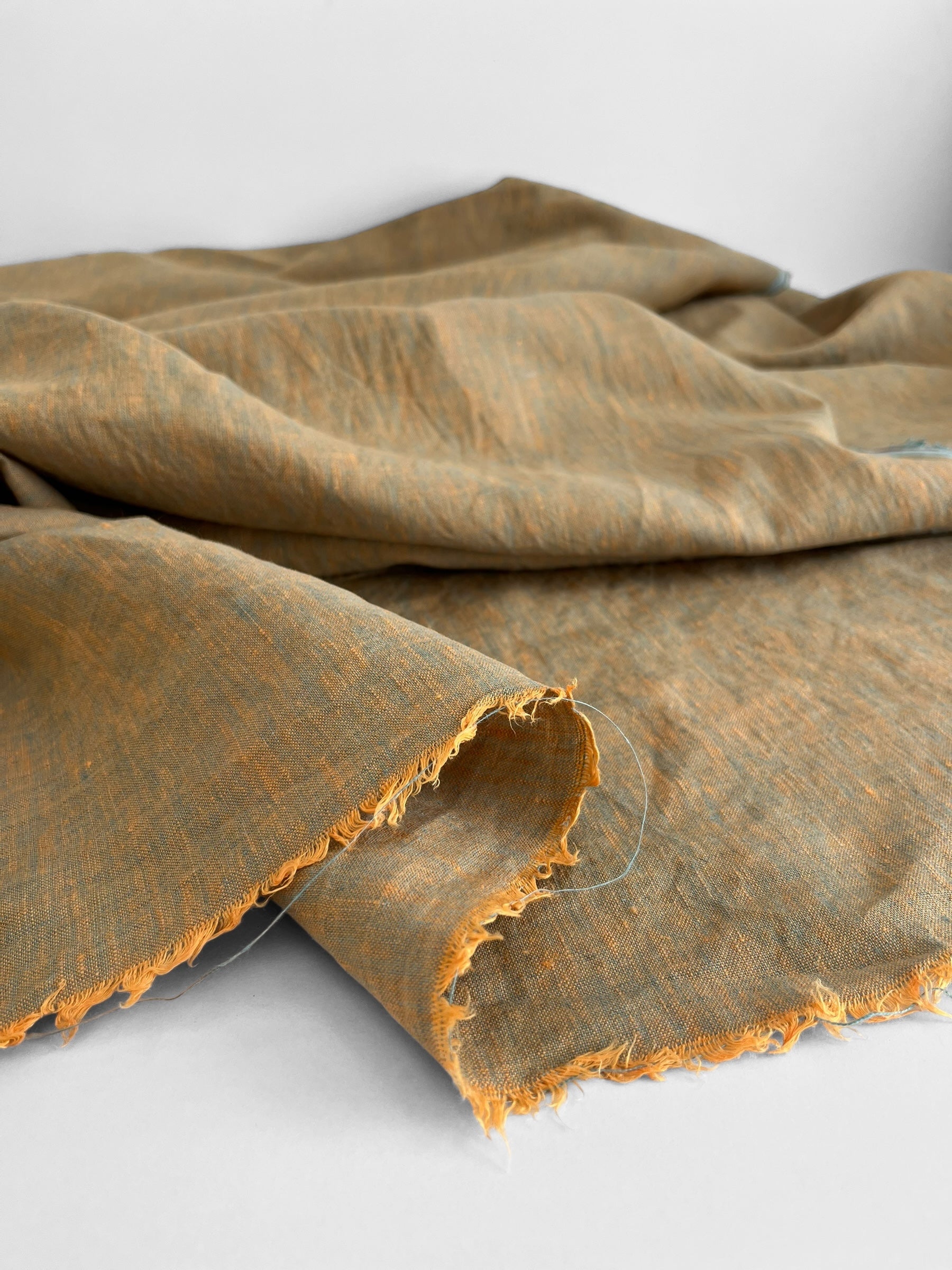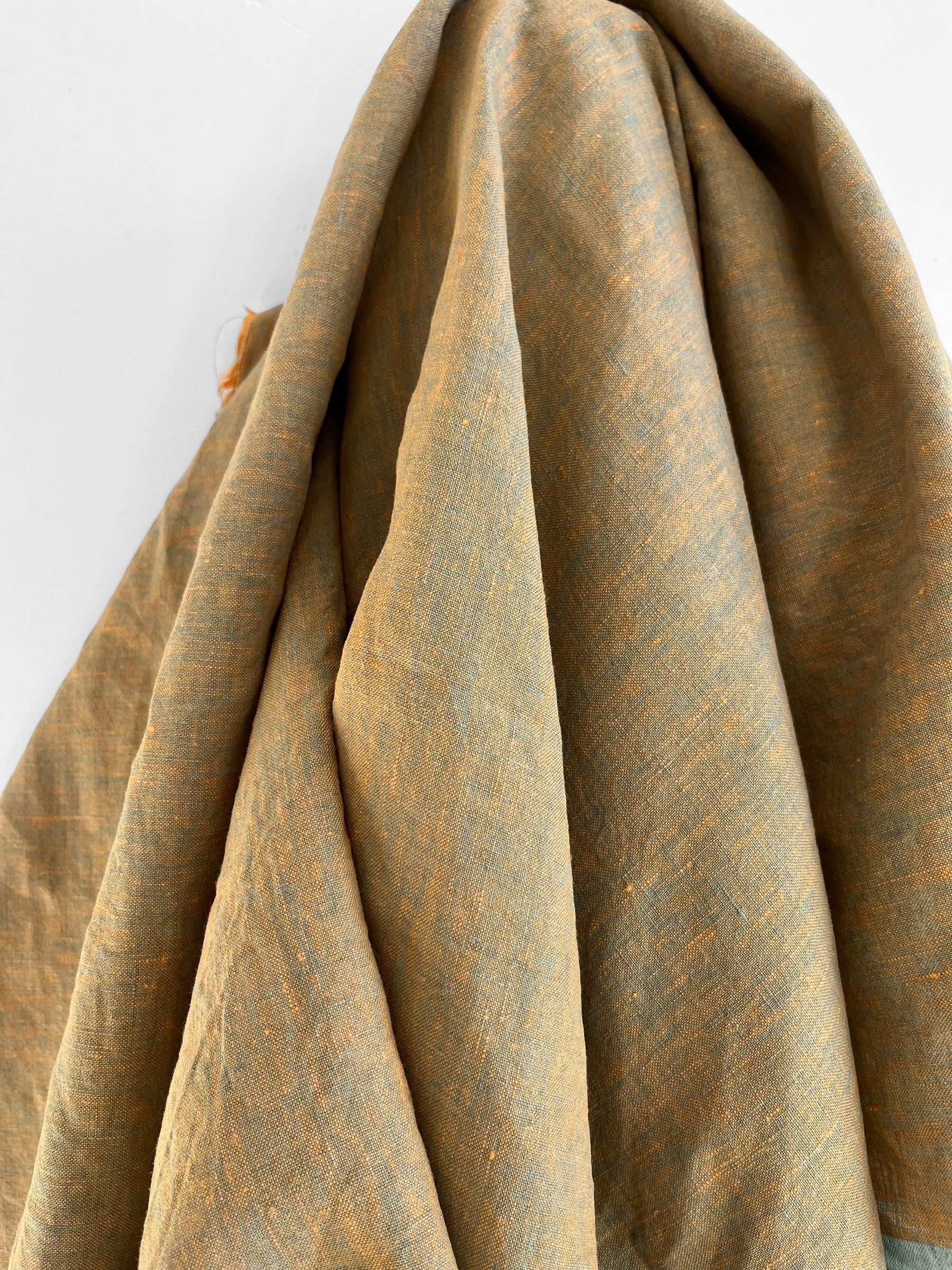 Premium quality linen/hemp blend woven out of two coloured yarn creating a unique melange look. Colours include orange and aqua blue.