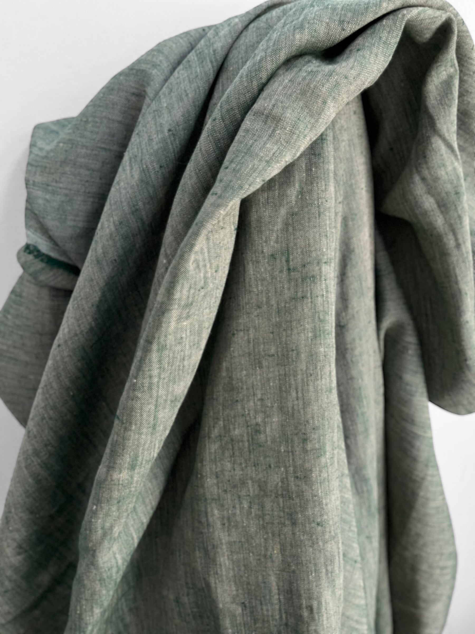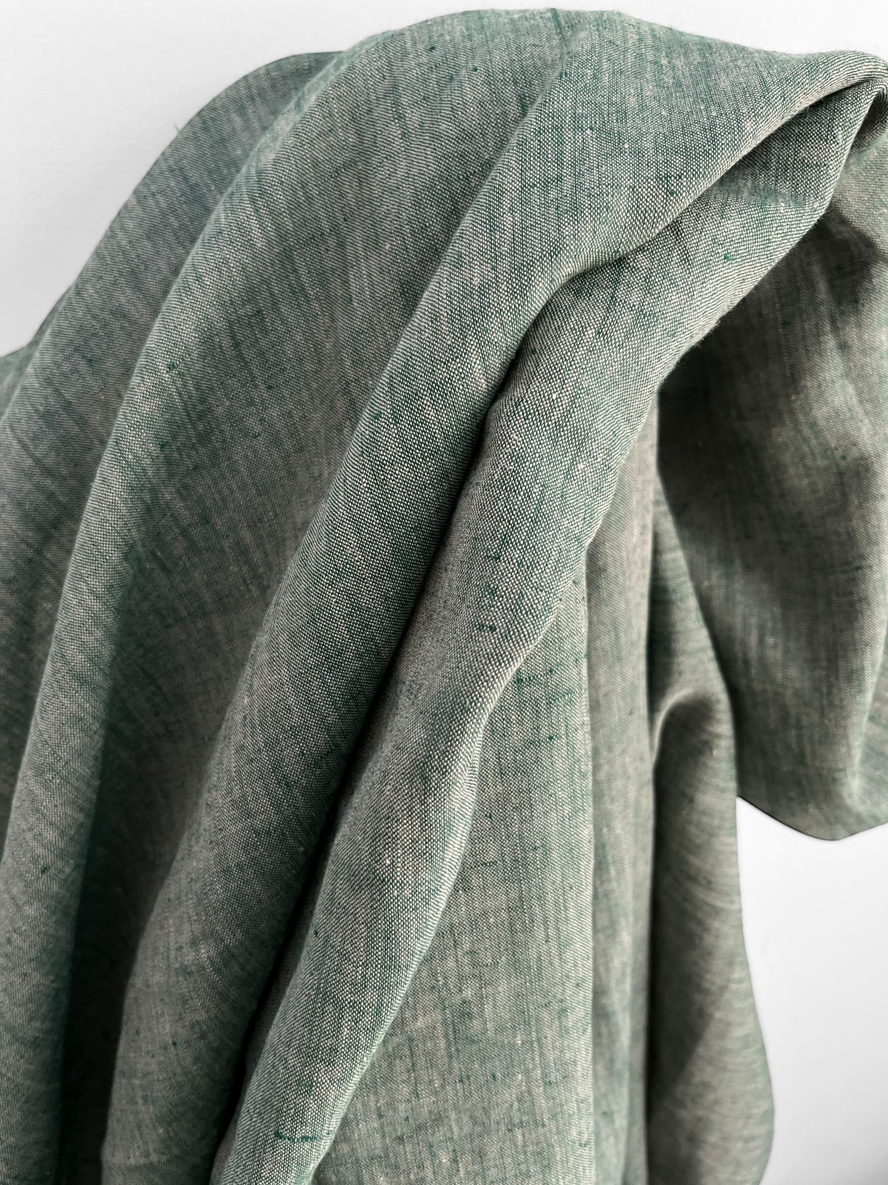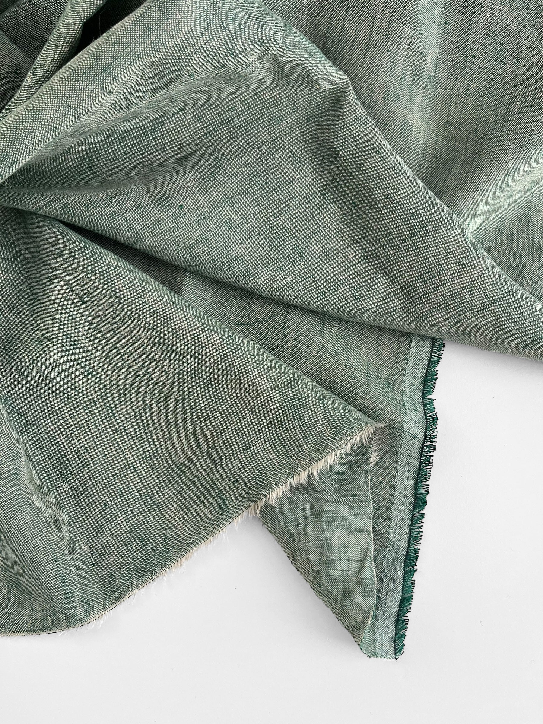 Premium quality linen/hemp blend woven out of two coloured yarn creating a unique melange look. Colours include a pine green and natural.