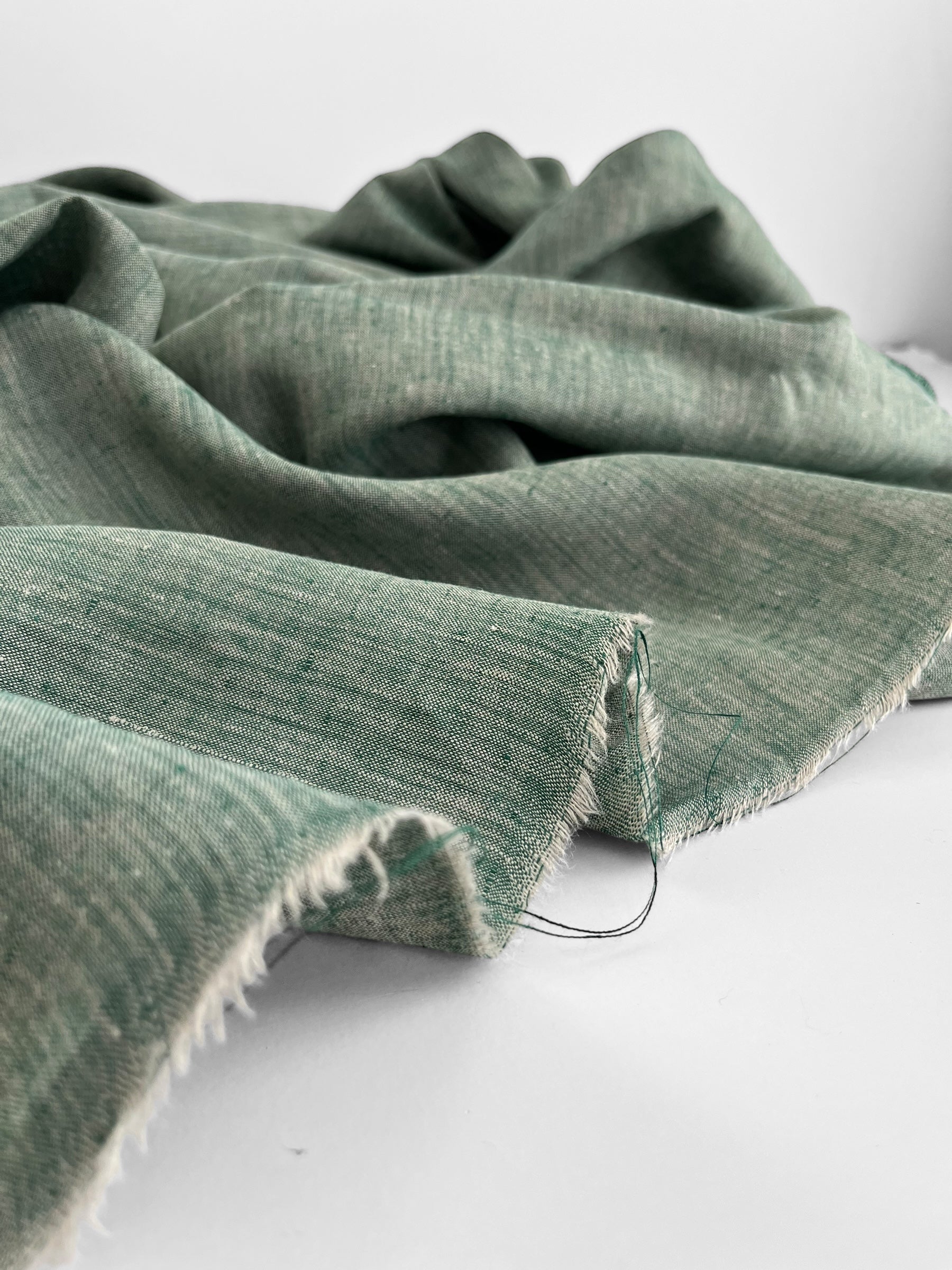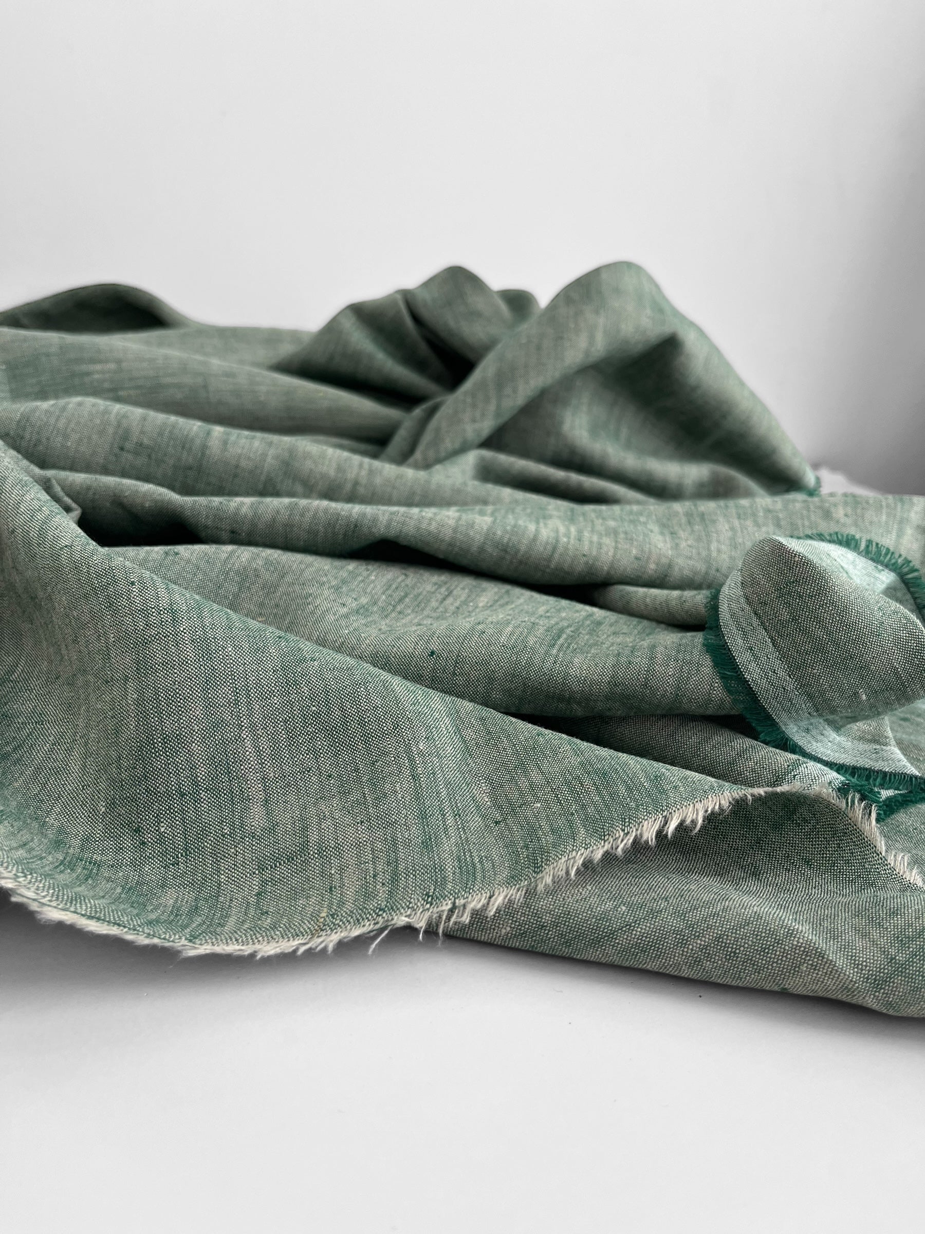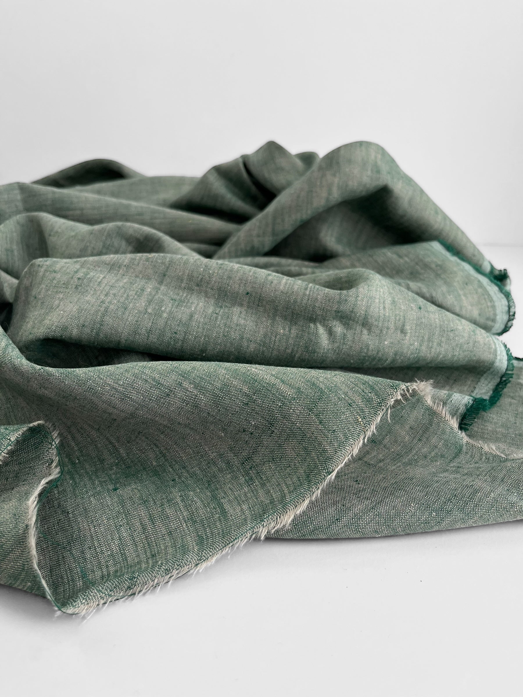 Premium quality linen/hemp blend woven out of two coloured yarn creating a unique melange look. Colours include a pine green and natural.