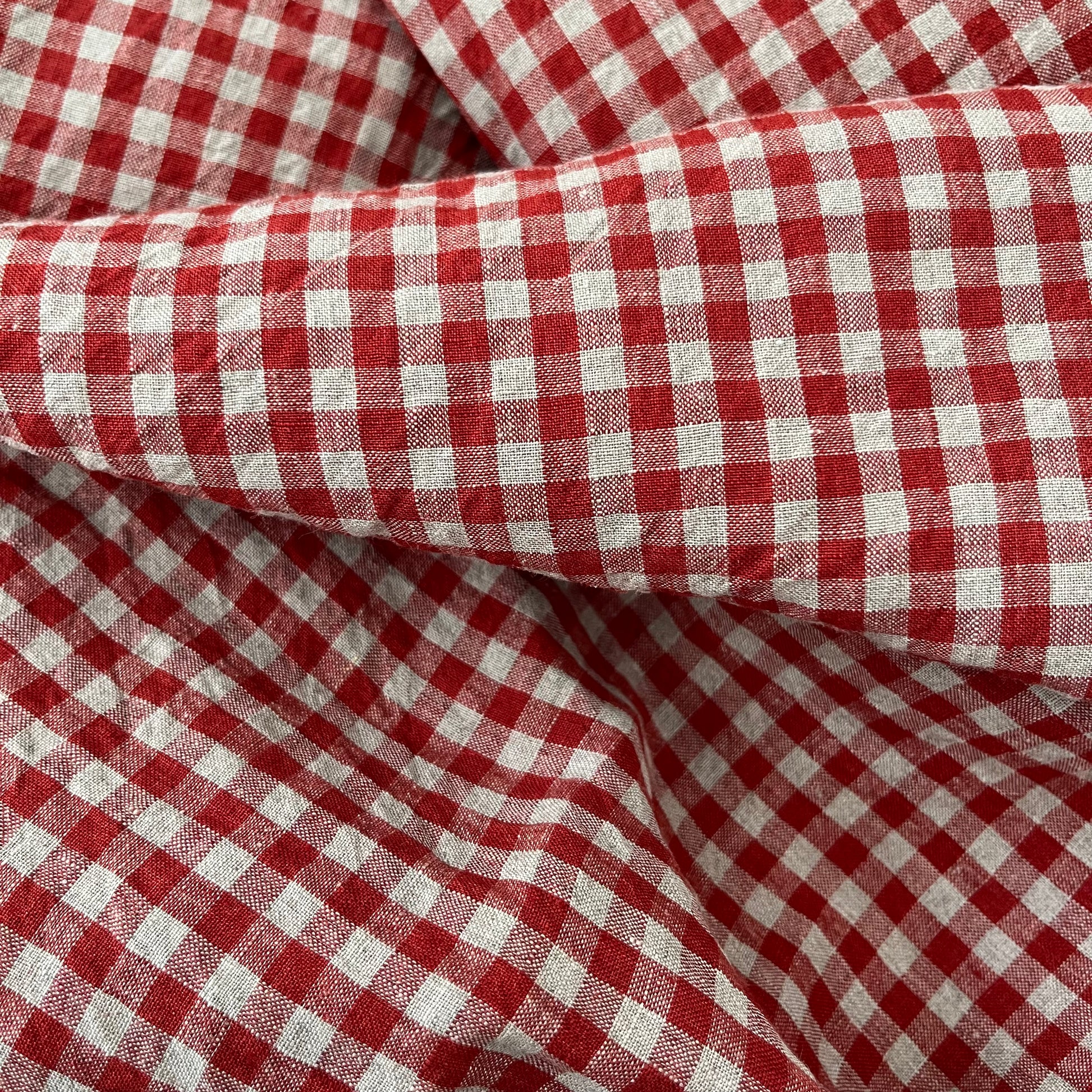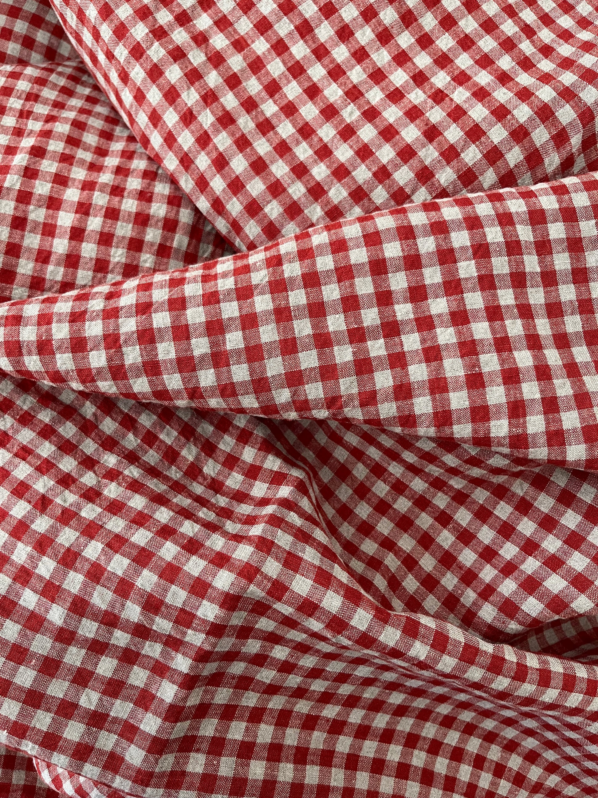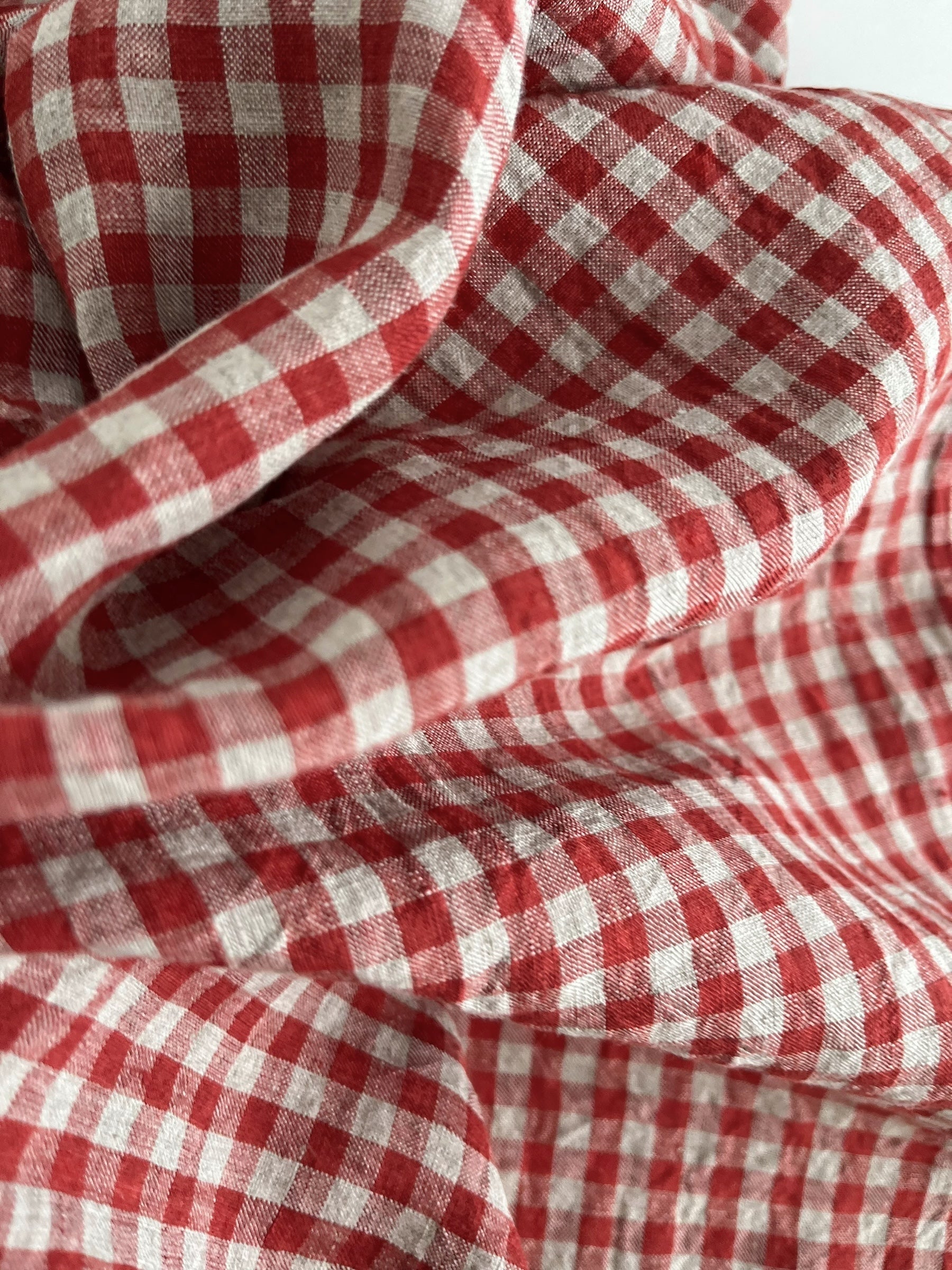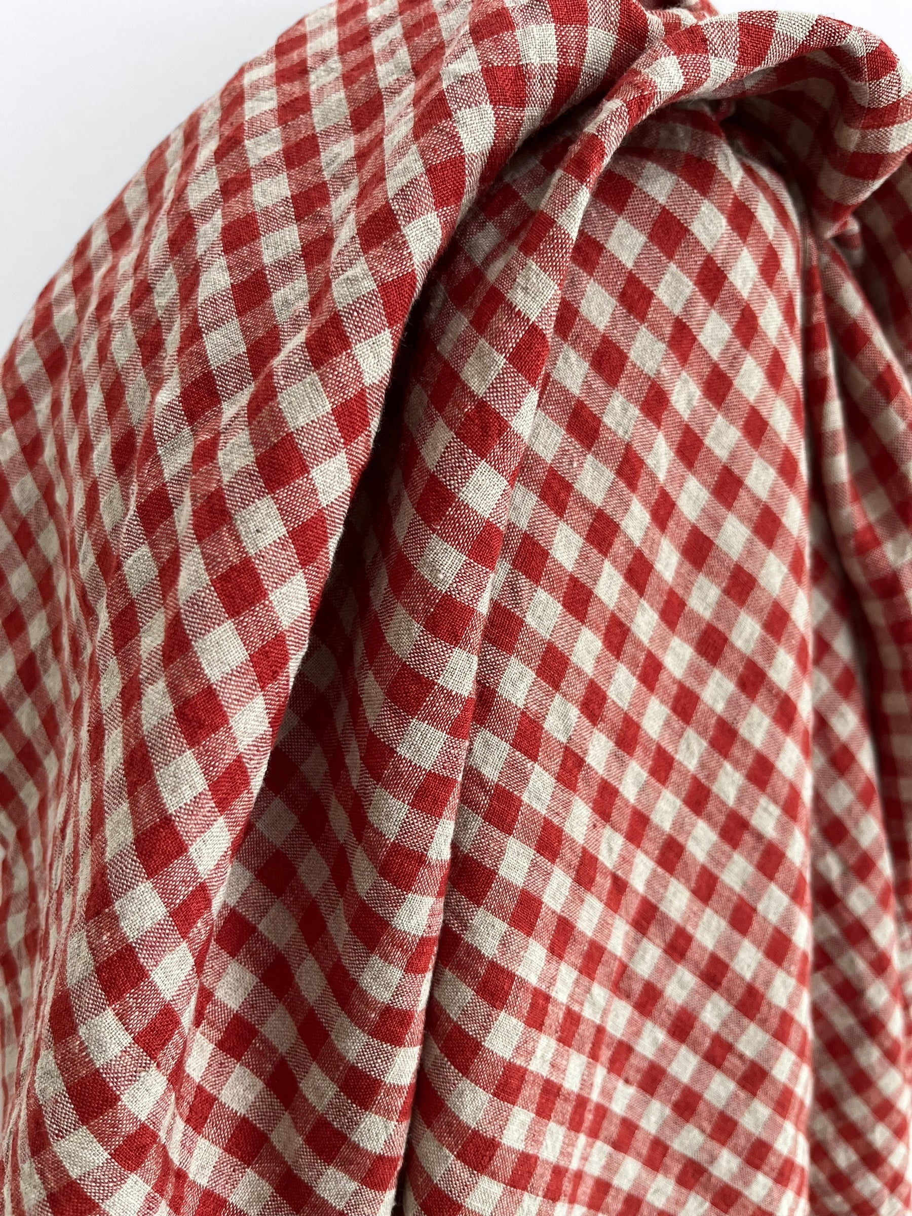 Premium quality 100% linen featuring a yarn dyed vintage gingham pattern. Colours include a vibrant red and natural flax.